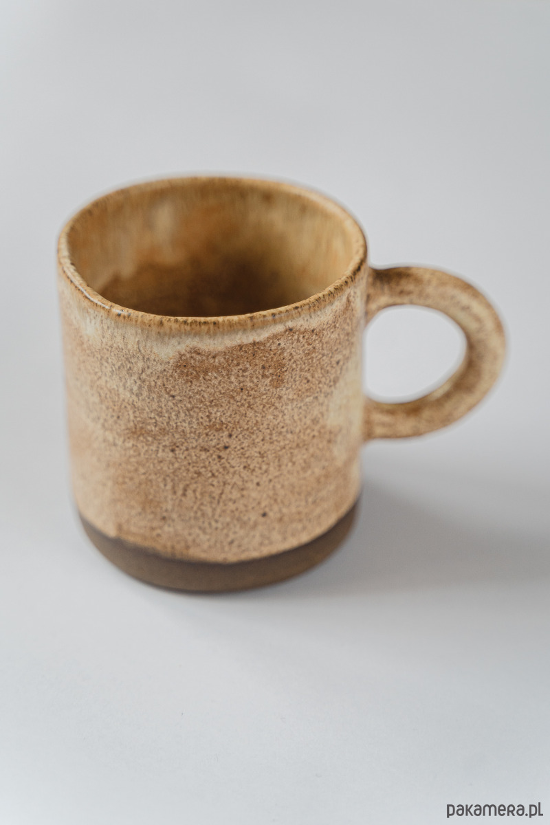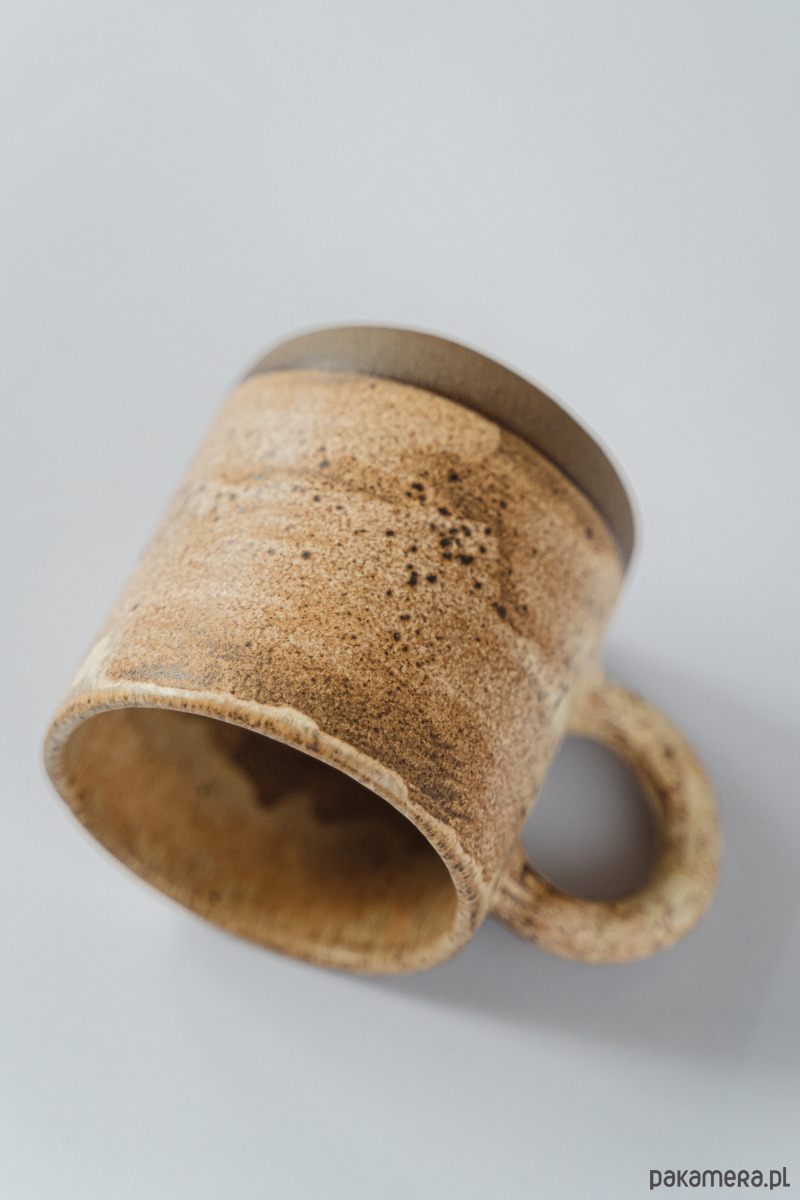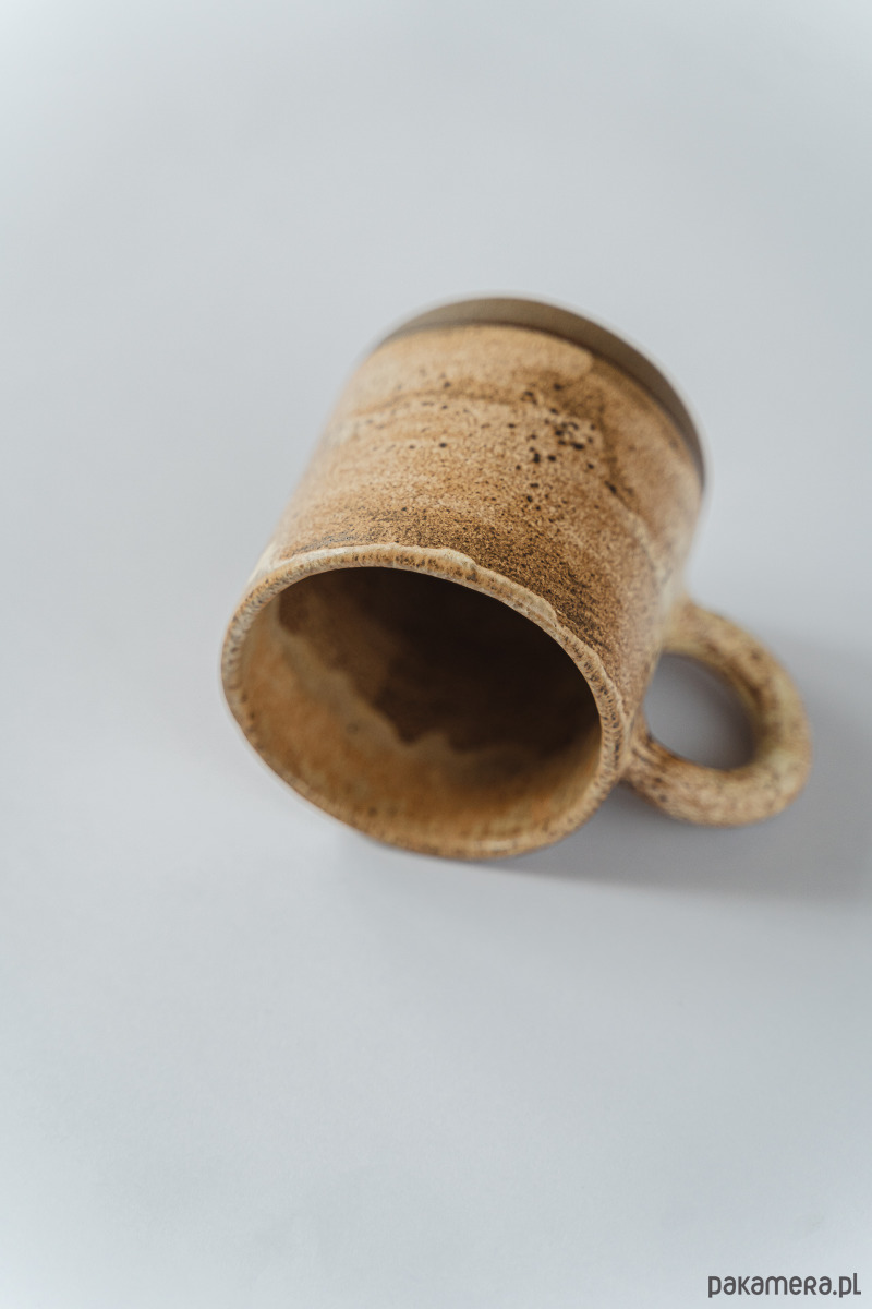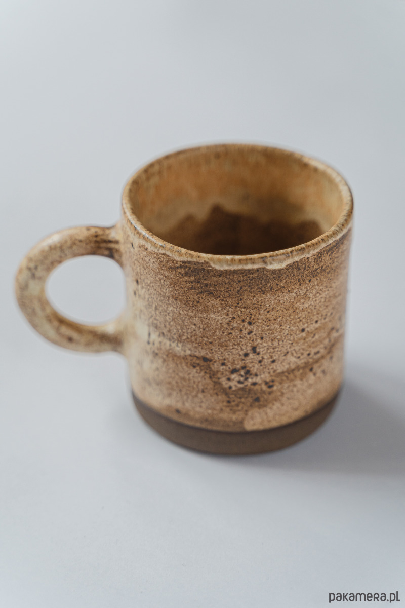 Ceramiczny kubek z uchem, wykonany ręcznie z ciemnej gliny, pokryty kilkoma rodzajami szkliwa.