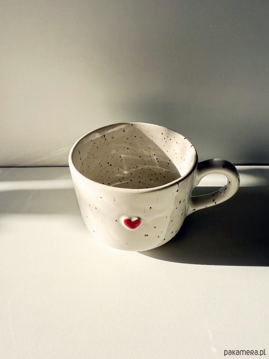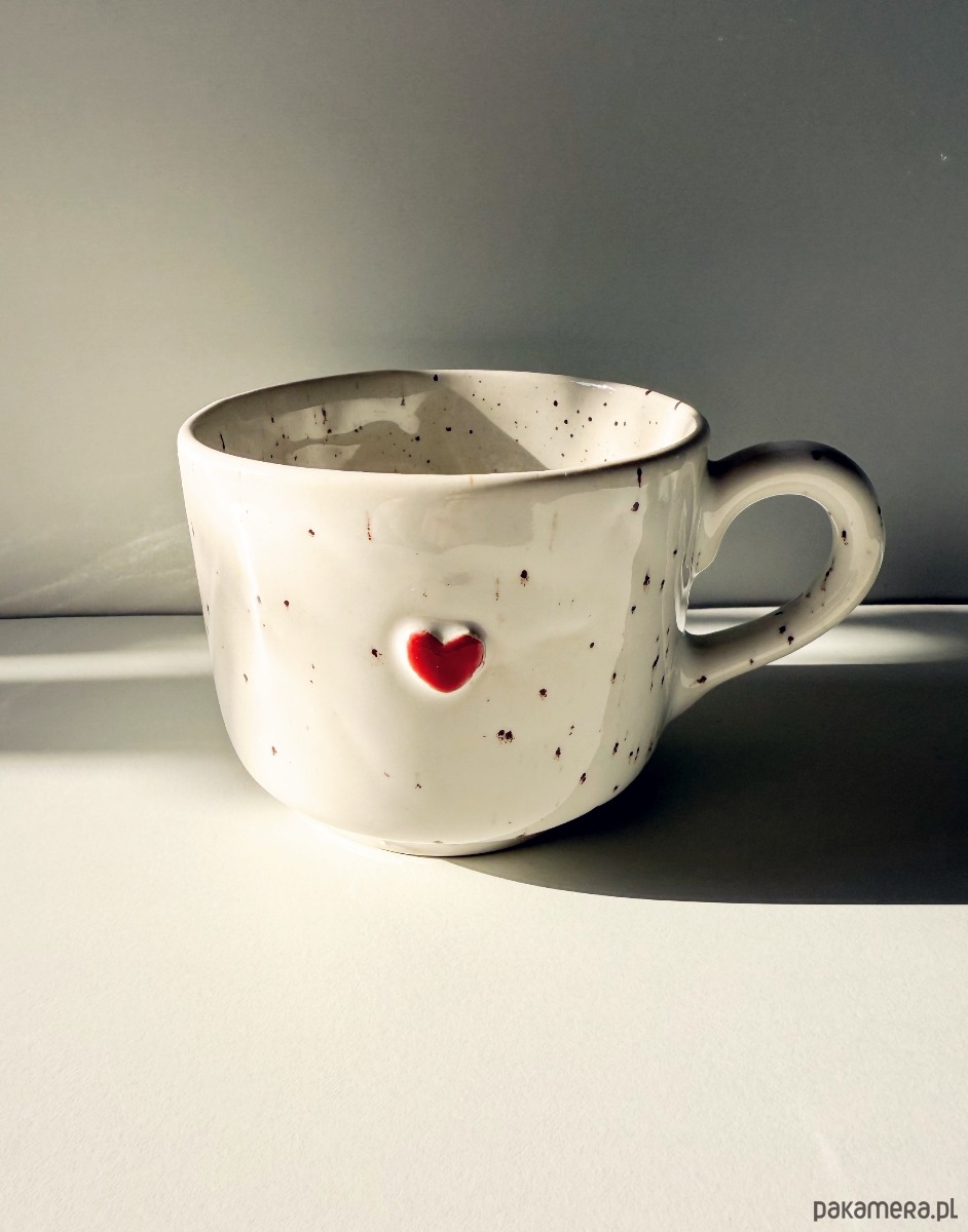 Minimalistyczny kubek z serduszkiem, pokryty białym szkliwem z piegami. Idealny na większą herbatę, zioła, kawę bądź czekoladę. Każda sztuka jest unikatowa, wykonana z jasnej gliny. Wszystkie nasze naczynia można myć w zmywarce. Pojemność ok 350 ml.