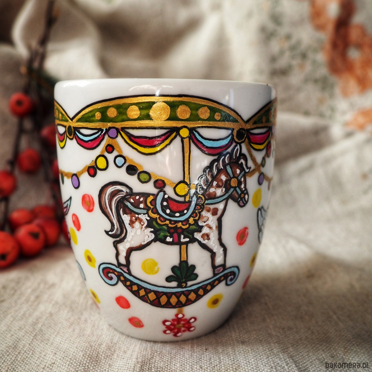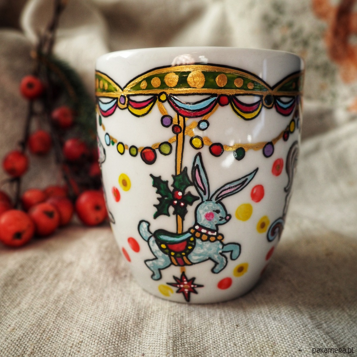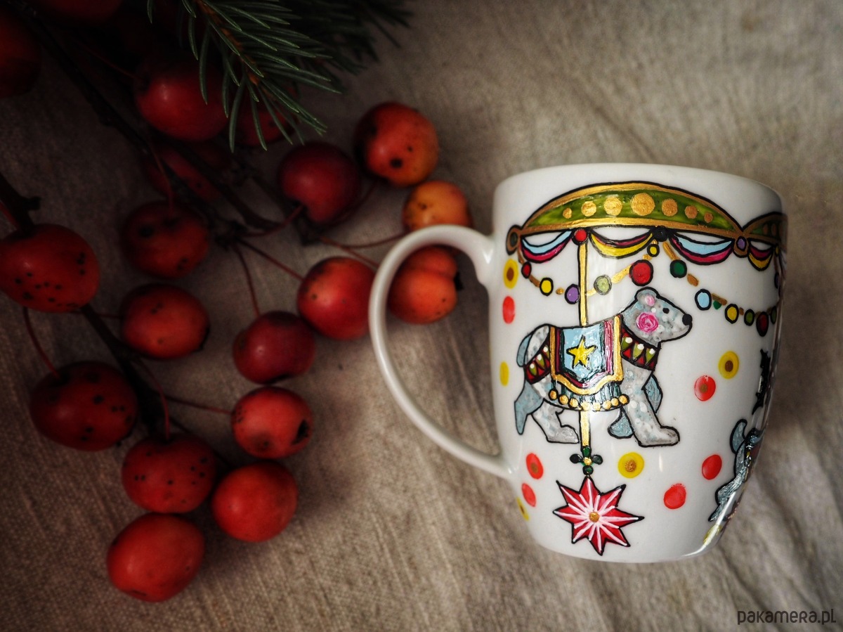 Kolorowy ręcznie malowany kubek będzie doskonałym podarunkiem dla osoby kochającej nastrój świąt.