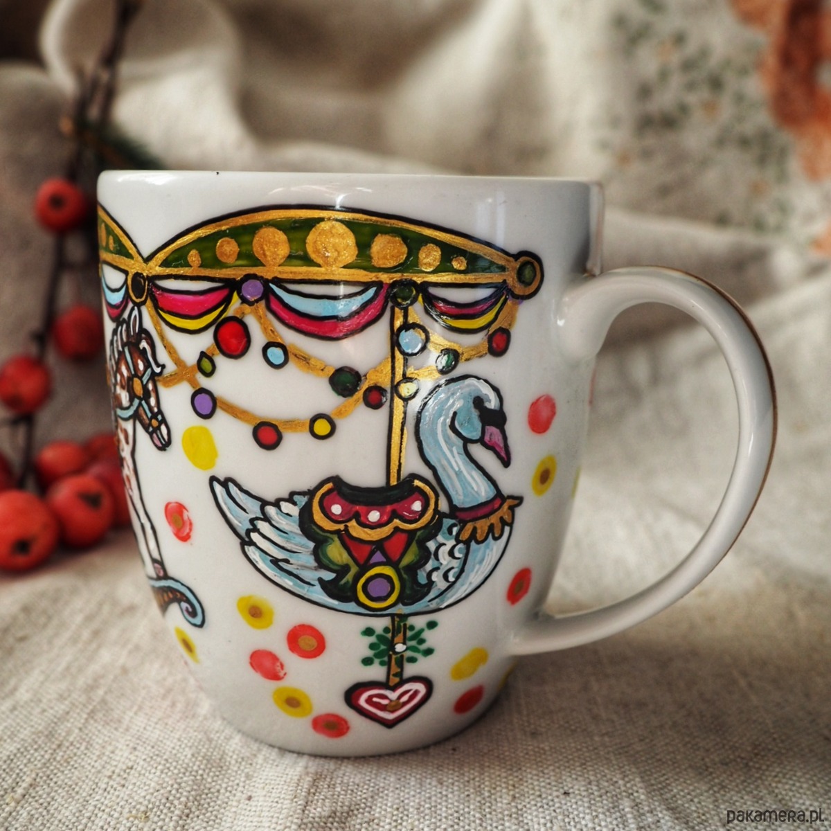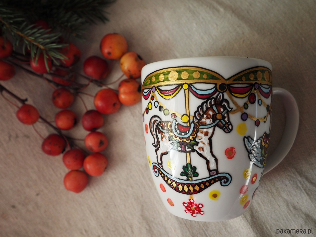 Wzór świątecznej karuzeli wykonany został przy użyciu nietoksycznych farb do porcelany, jest wodoodporny - naczynie może być myte ręcznie, bez użycia ostrych narzędzi.
