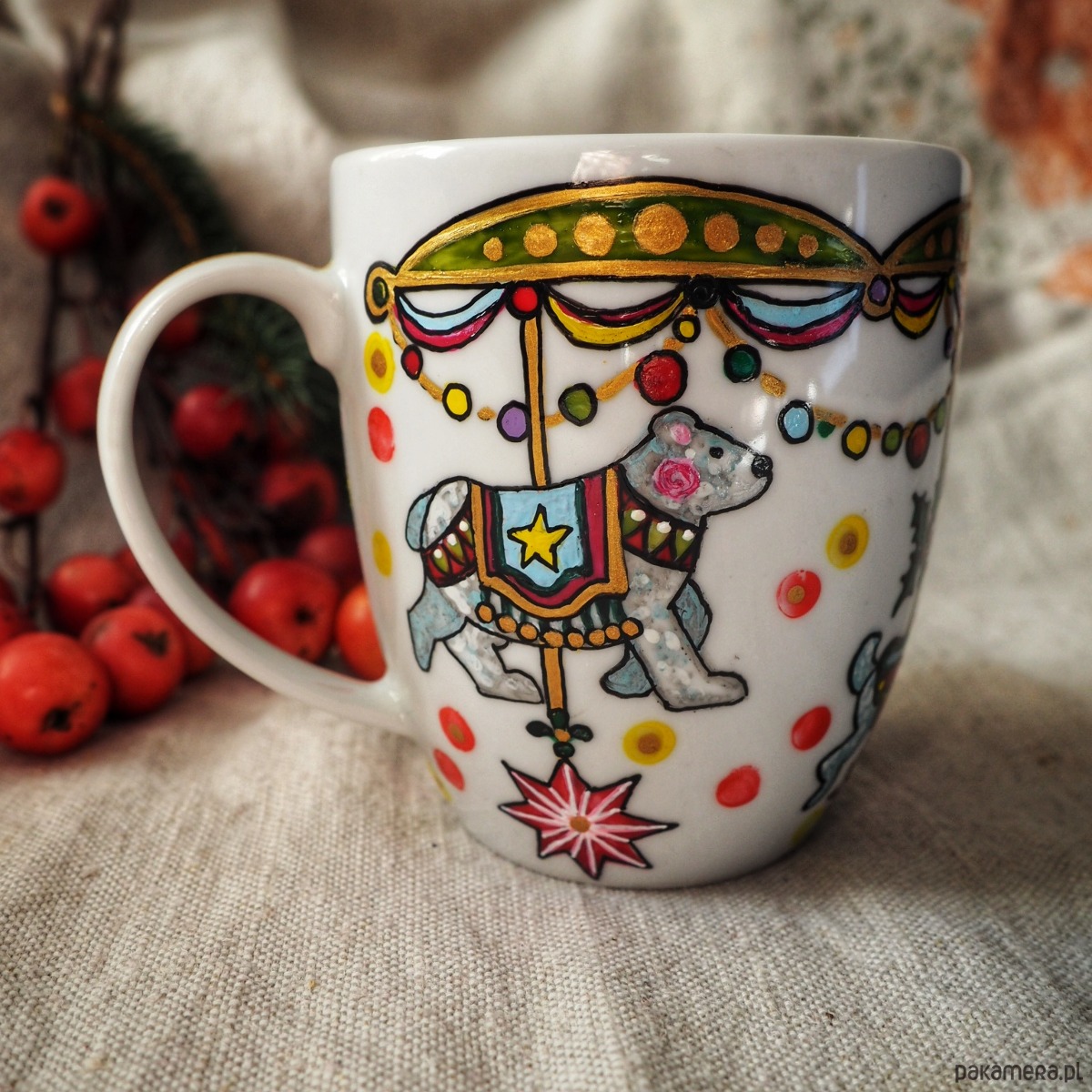 Kolorowy ręcznie malowany kubek będzie doskonałym podarunkiem dla osoby kochającej nastrój świąt.