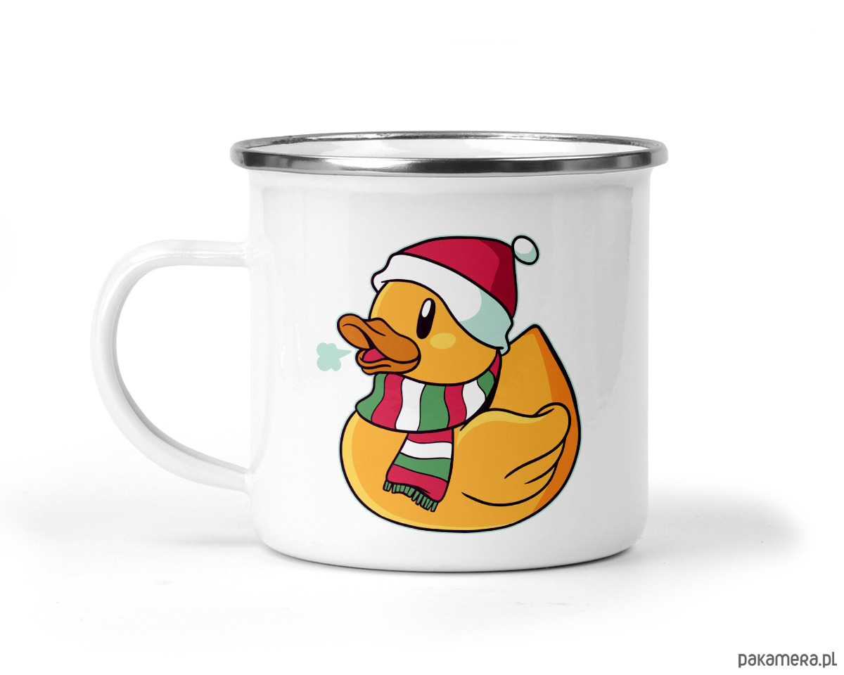 Emaliowany kubek wraz z grafiką widoczną na zdjęciach.