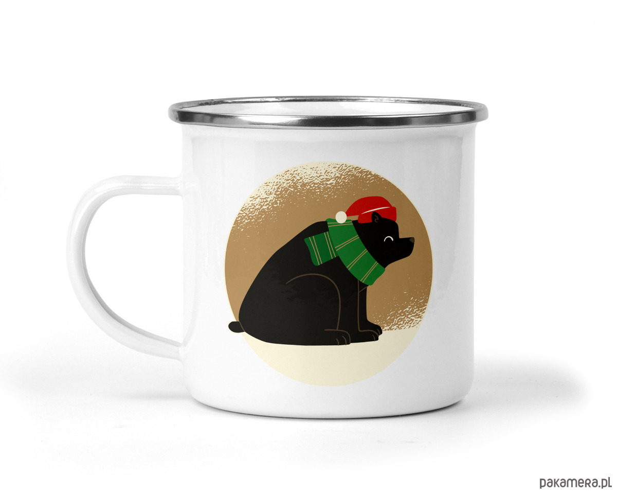 Emaliowany kubek wraz z grafiką widoczną na zdjęciach.