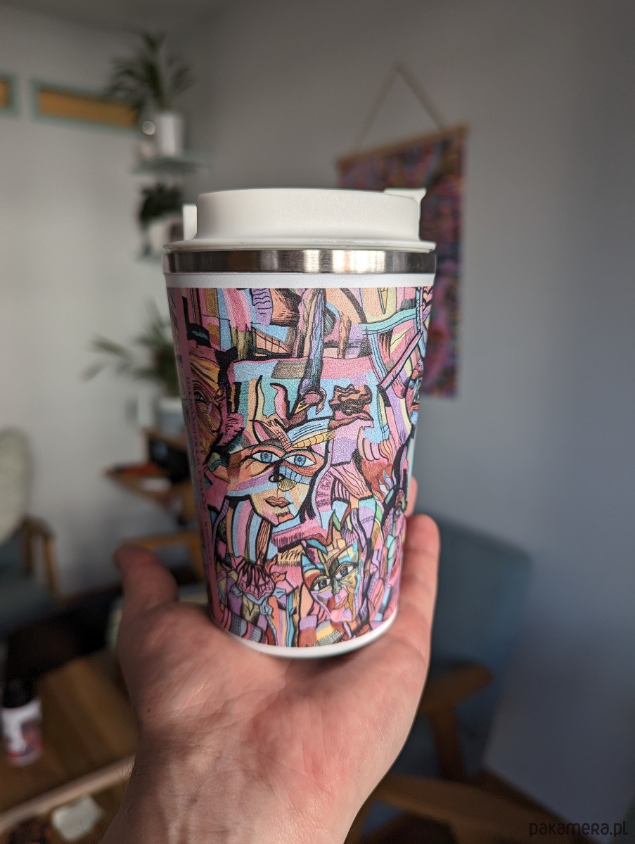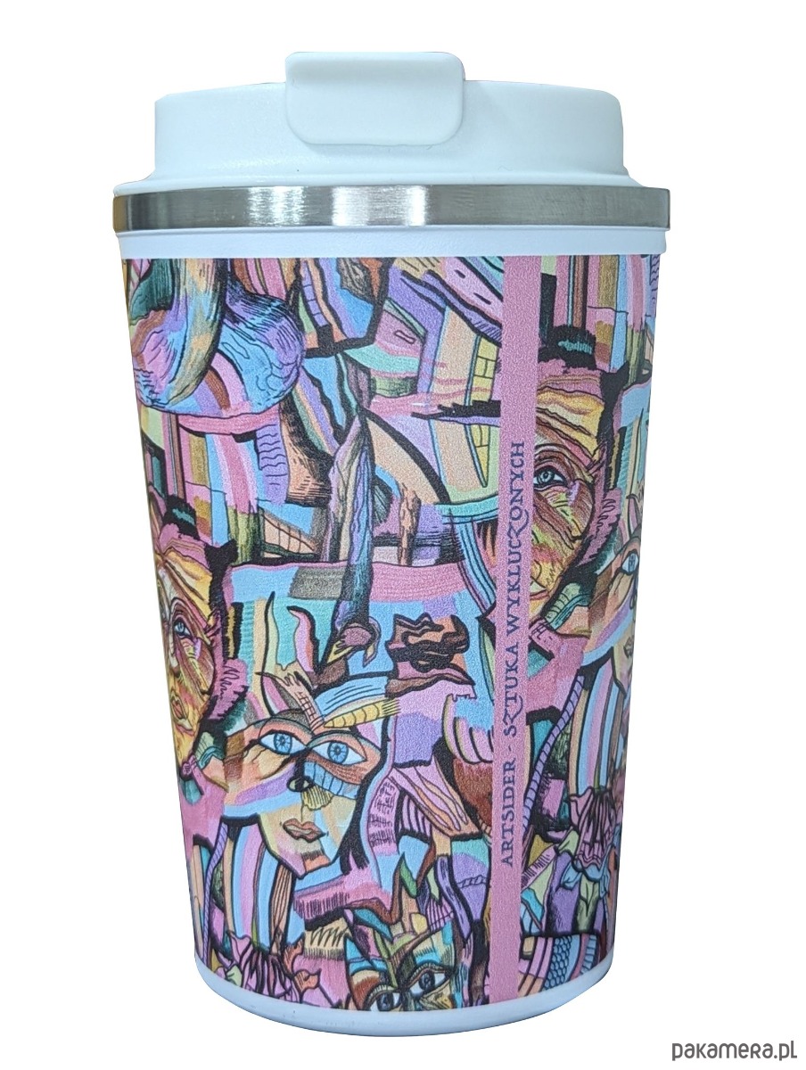 Kubek termiczny Artsider, organizacji wspierającej sztukę osób wykluczonych, na którym znajduje się wyjątkowy obraz pani Sylwii Mensfeld, chorującej na schizofrenię.