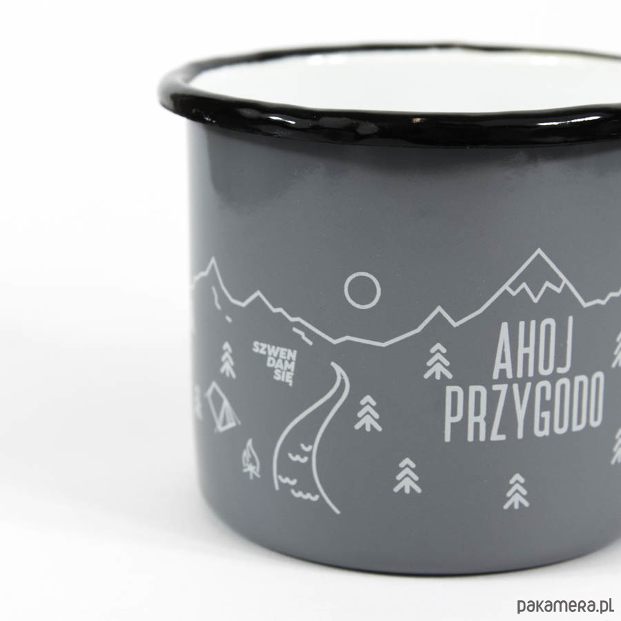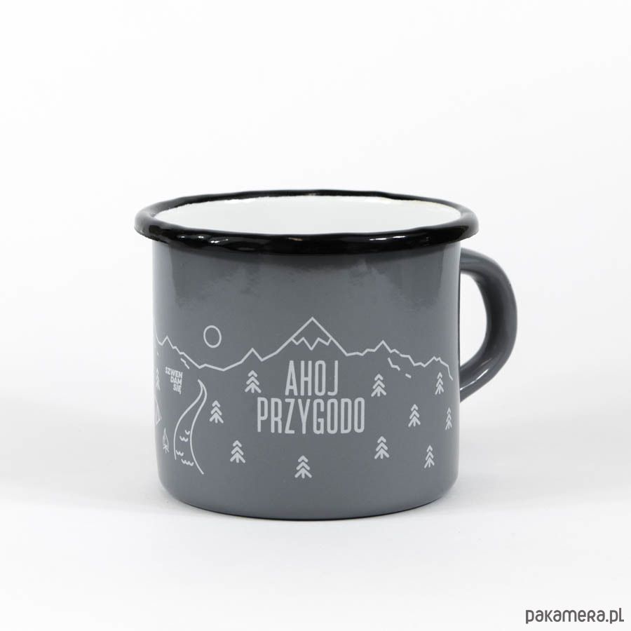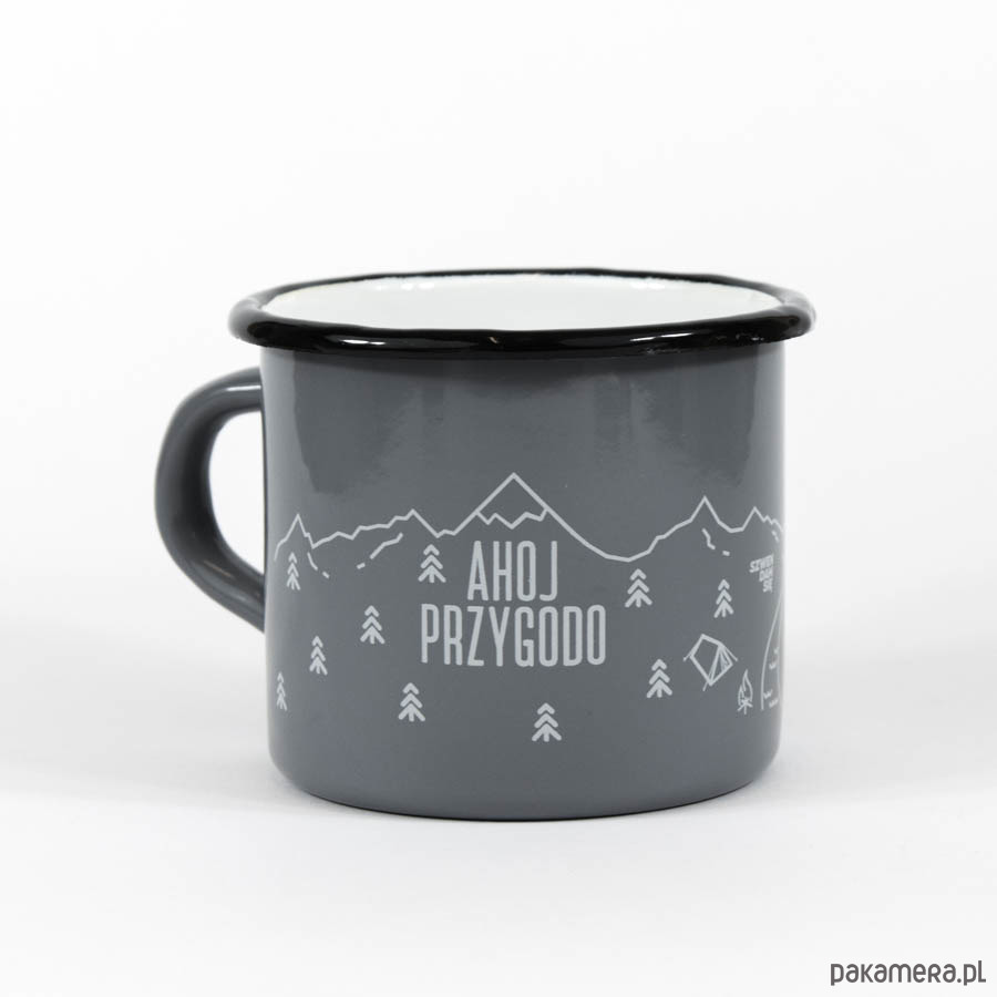 Uniwersalny i ponadczasowy kubek emaliowany Ahoj przygodo. Sprawdzi się w warunkach domowych, a także w terenie podczas wycieczek i biwaków. Niestraszne mu gotowanie na palniku, dlatego spokojnie zastąpi kubek turystyczny. Posiada szerokie spektrum zastosowań m.in. zagotujecie w nim wodę, zaparzycie kawę lub herbatę oraz przygotujecie błyskawiczną zupkę. Kultowy kubeczek rodem z PRL-u stanowi idealny pomysł na prezent dla podróżników. Pakowany jest w eleganckie eko-pudełko fasonowe z okienkiem, dzięki czemu nadaje się do natychmiastowego wręczenia.Szary kubek emaliowany ozdabia wytrzymały i odporny na zmywanie nadruk wykonany techniką sitodruku. Grafika w klimacie podróżniczym przedstawia duży napis AHOJ PRZYGODO oraz poszarpane szczyty górskie, potok, drzewa iglaste i rozbity namiot. Metalowy kubek Szwendam się będzie ciekawym uzupełnieniem Waszego wyprawowego ekwipunku. Na pewno przyda się w trakcie górskich wędrówek, leśnych spacerów, spływów kajakowych i na kempingach. Każdy turysta potwierdzi, że gorąca herbata najlepiej smakuje w plenerze!Specyfikacja kubka:- pojemność: 500 ml- średnica: 9 cm- wysokość: 8 cm- kolor zewnętrzny: szary- kolor wewnętrzny: biały- kolor rantu: czarny- kolor nadruku: jasnoszary- pakowany w elegancki eko-kartonik z okienkiemKubki zostały wyprodukowane w Polsce z wysokogatunkowej stali, którą następnie pokryto specjalną warstwą emalii. Szklista powłoka odpowiednio zabezpiecza powierzchnię naczyń i sprawia, że są one niezwykle higieniczne. Garnki emaliowane w czasie gotowania nie uwalniają żadnych niebezpiecznych związków, z tego powodu poleca się je przede wszystkim dzieciom, a także alergikom. Kubków emaliowanych można używać na kuchenkach gazowych, elektrycznych oraz indukcyjnych, ale ze względu na nadruk nie można myć ich w zmywarce!Kwintesencją kubków emaliowanych jest ich niedoskonałość, dzięki czemu nie ma dwóch takich samych sztuk. Kubki mogą, ale nie muszą, posiadać drobne skazy, które powstają w trakcie produkcji. Najbardziej zdeformowane modele odrzucamy podczas kontroli jakości, jednak pozostałym pozwalamy żyć i zachwycać swoim niepowtarzalnym wyglądem. Prosimy Was o świadome i przemyślane zakupy. Pamiętajcie, że to co dla jednych jest wadą, dla drugich może być zaletą.