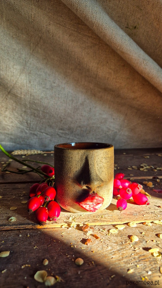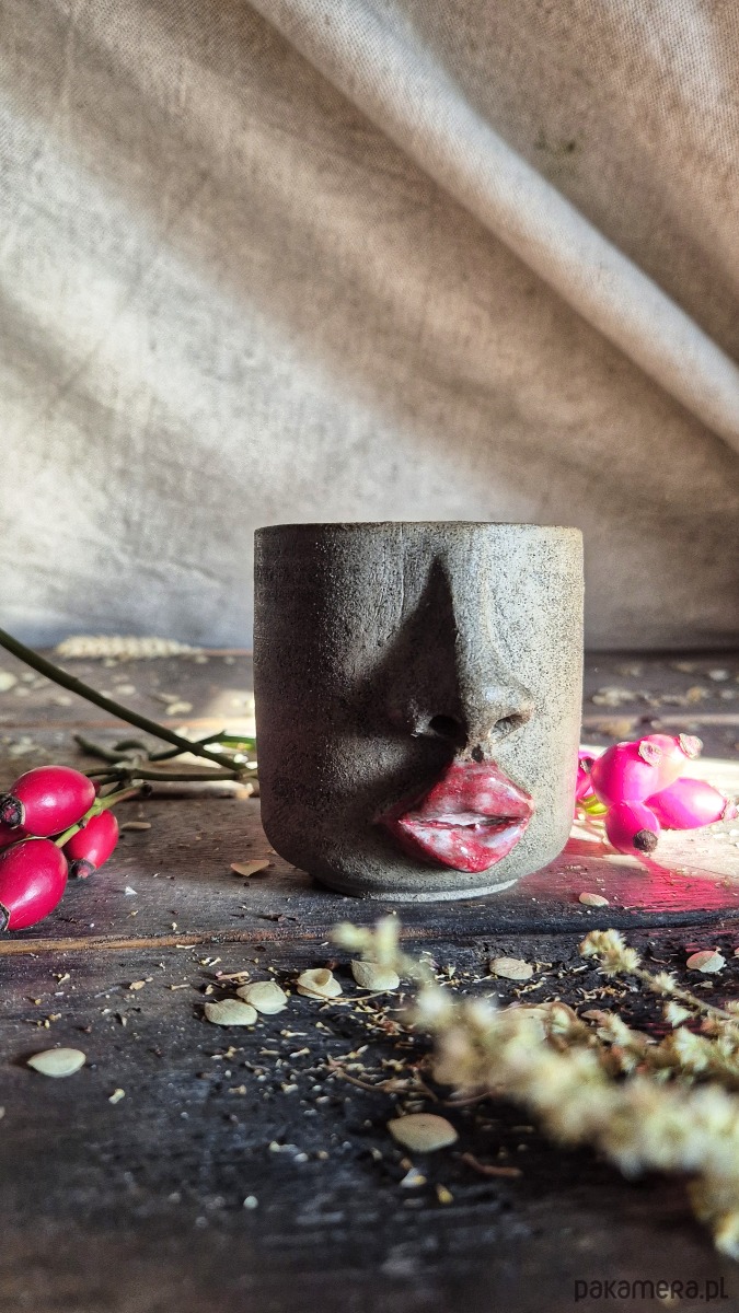 Ten wyjątkowy kubek to małe dzieło sztuki użytkowej. Został ręcznie toczony na kole garncarskim, a następnie rzeźbiony, aby nadać mu niepowtarzalny charakter – z wyraźnie zarysowanym nosem i ustami w intensywnym odcieniu czerwieni.