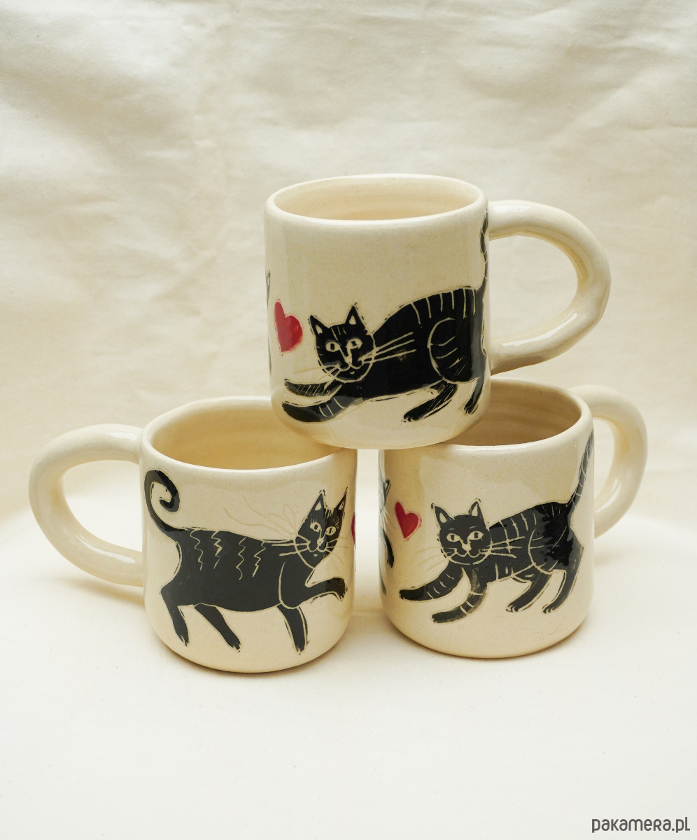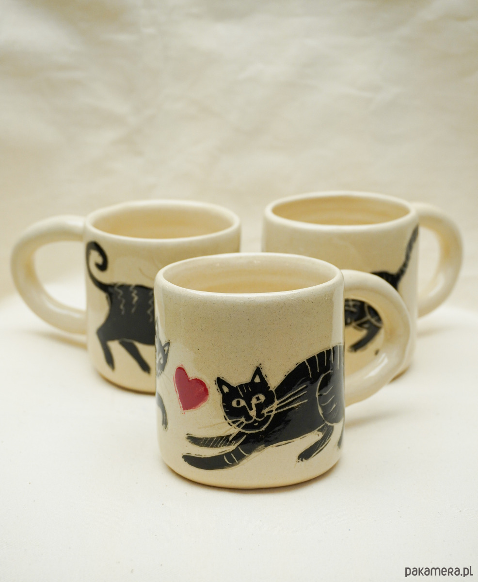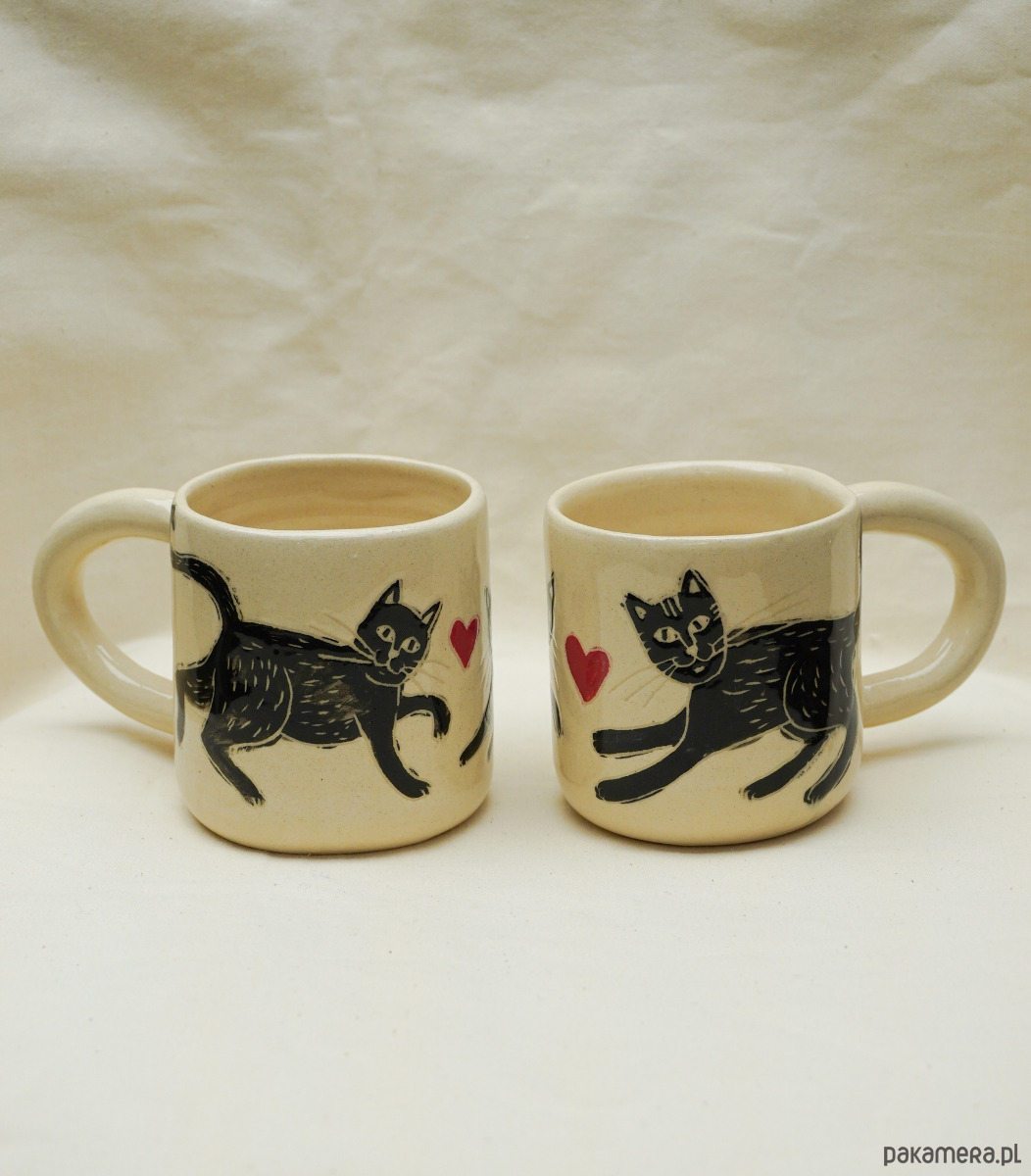 Jak herbata to tylko w naszych zabawnych kubkach z motywem figlarnych, zakochanych psów. Koty są czarne, a pomiędzy nimi czerwone serduszko. Wykonane z jasnej gliny, wytoczone na kole garncarskim i ozdobione ręcznie namalowanymi metodą sgraffito kotkami. To idealny wybór dla miłośników piesków i unikalnego rzemiosła. Czarka świetnie sprawdzi się do porannej kawy i herbaty.