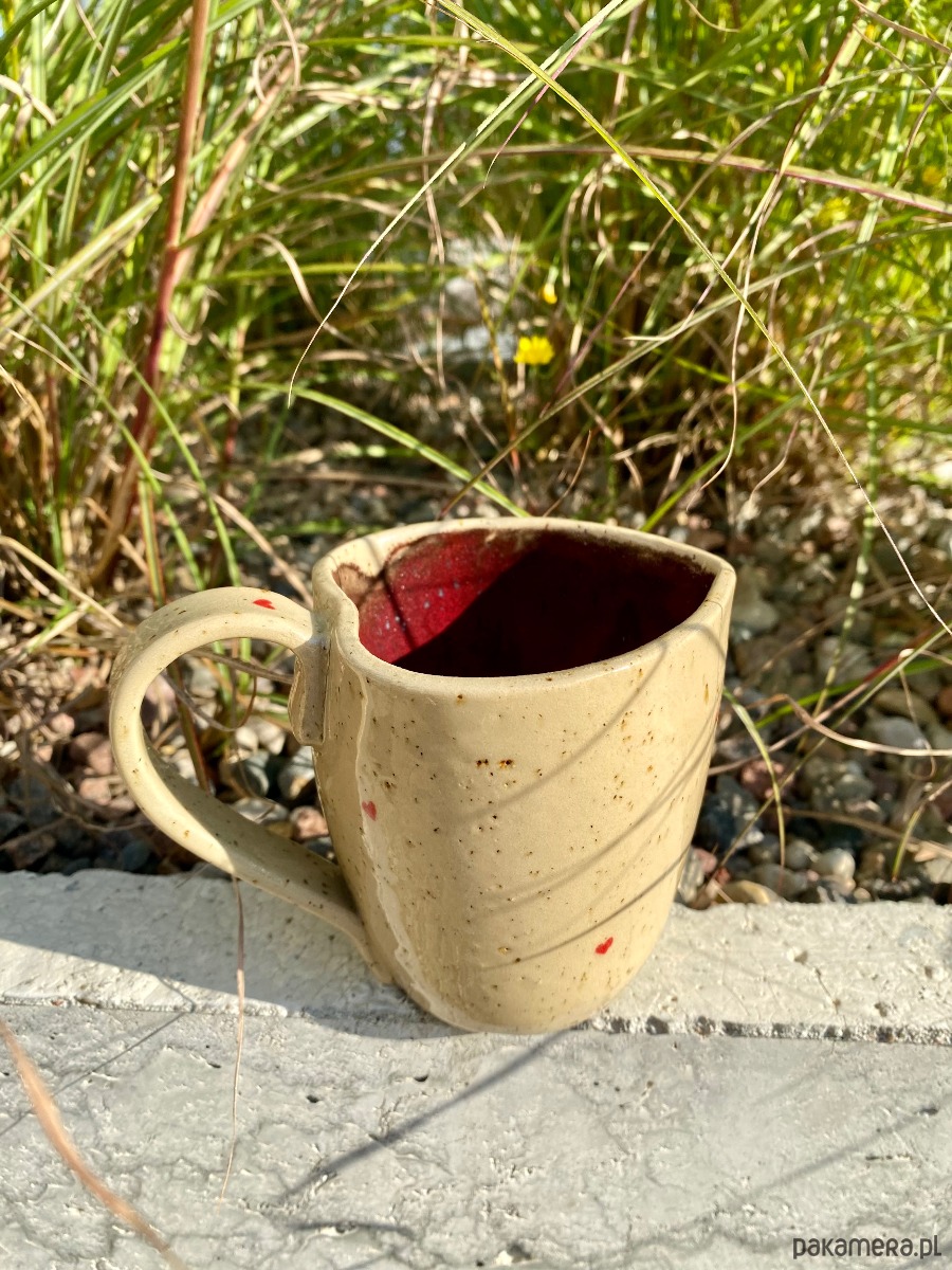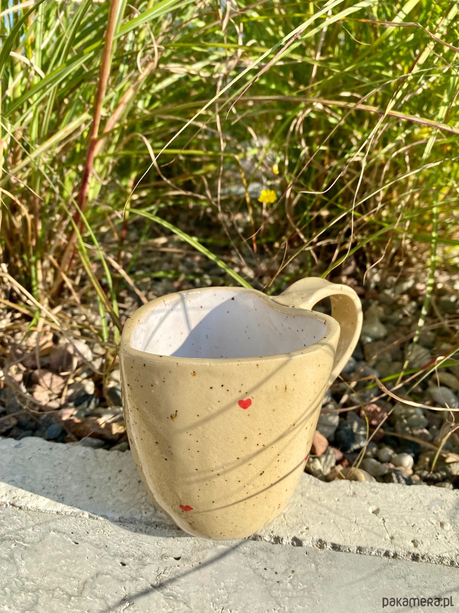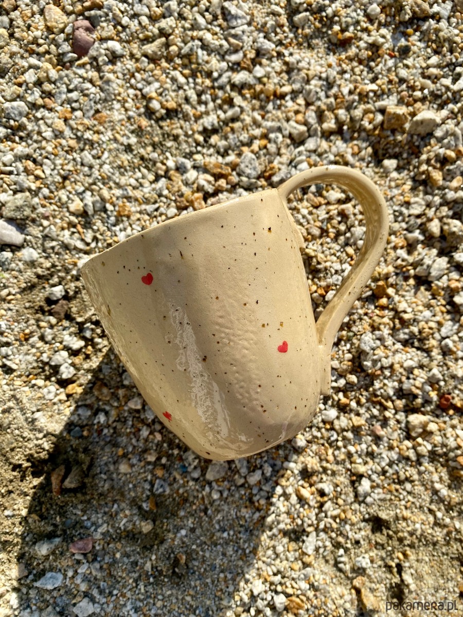 Ręcznie lepiony kubek o pojemności ok. 300 ml, wykonany z kremowej gliny w delikatne kropeczki. Na zewnątrz ręcznie malowane serduszka pokryte transparentnym szkliwem, w środku szkliwo czerwone lub białe do wyboru. Szkliwa są bezpieczne.