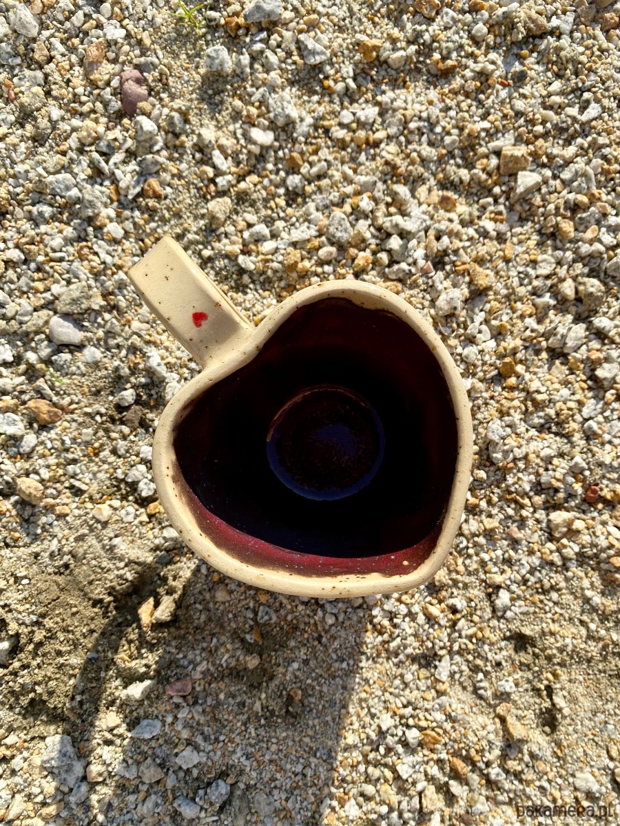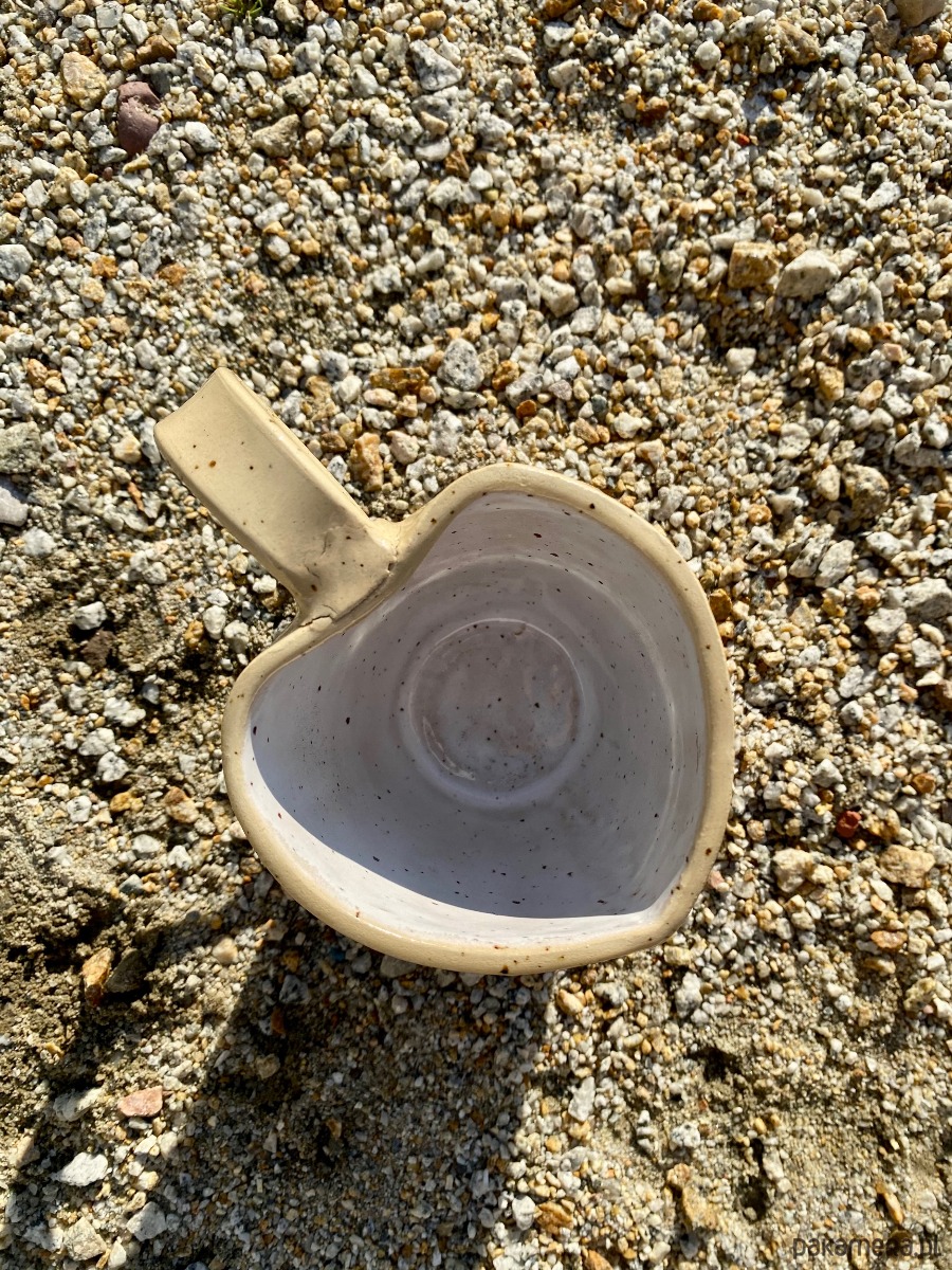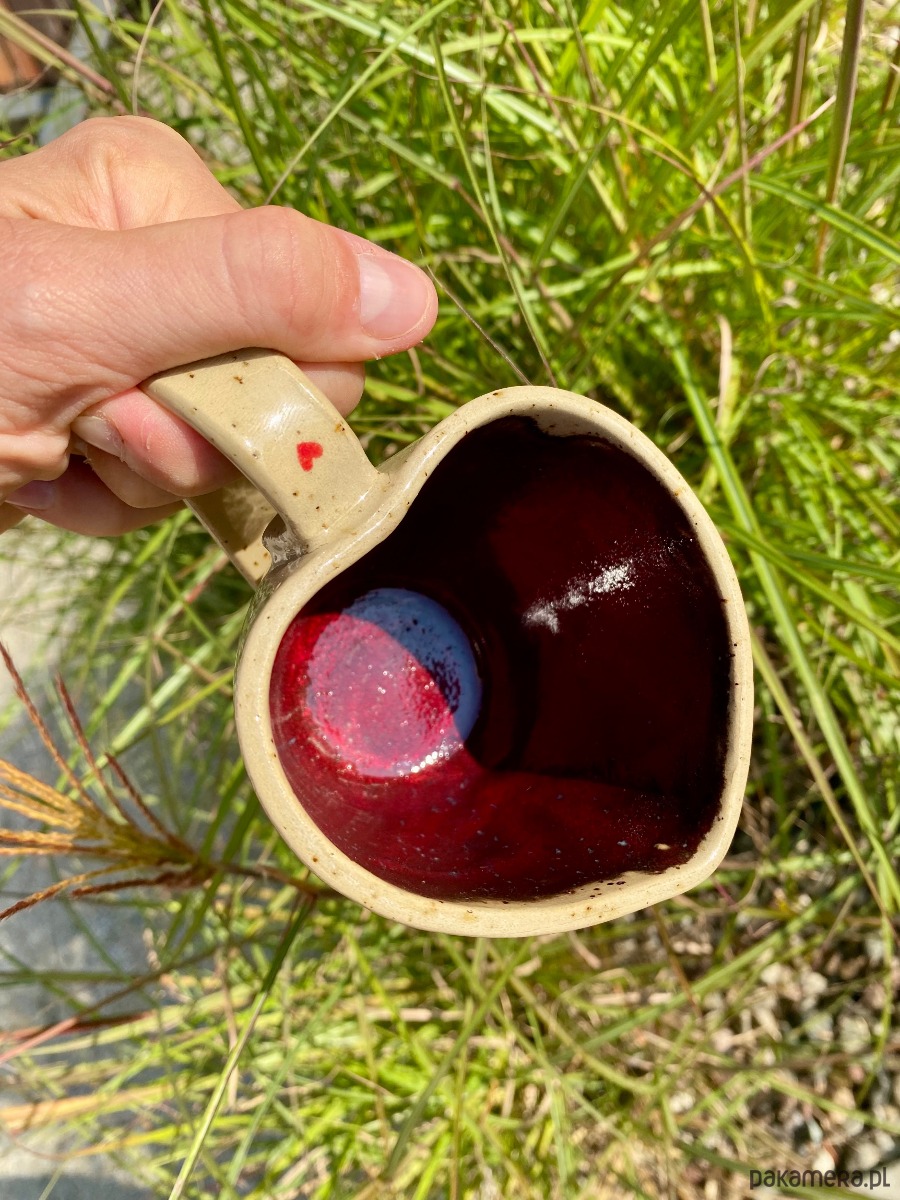 Ręcznie lepiony kubek o pojemności ok. 300 ml, wykonany z kremowej gliny w delikatne kropeczki. Na zewnątrz ręcznie malowane serduszka pokryte transparentnym szkliwem, w środku szkliwo czerwone lub białe do wyboru. Szkliwa są bezpieczne.