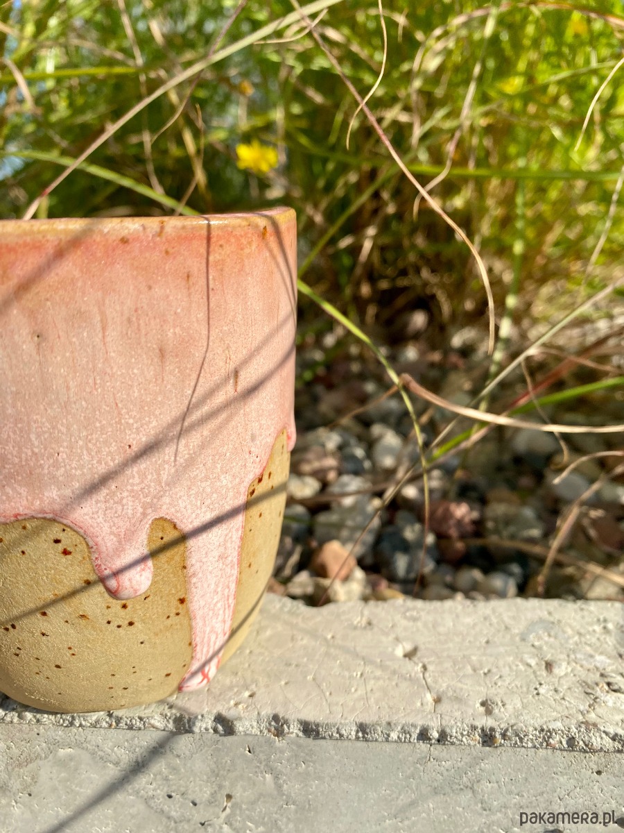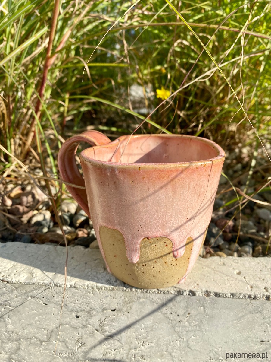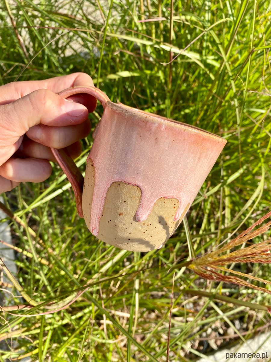 Ręcznie lepiony kubek o pojemności ok. 300 ml, wykonany z kremowej gliny w delikatne kropeczki. Pokryty bezpiecznym szkliwem spożywczym, idealny na co dzień. Szkliwo w odcieniach różu pięknie spływa po surowej powierzchni kubka.