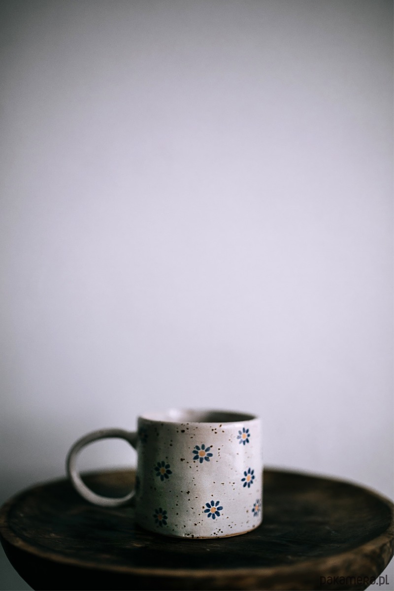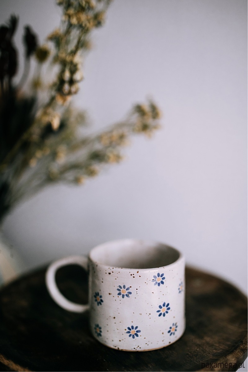 Został poszkliwiony białym szkliwem, spod którego wyłaniają się urocze, ciemnobrązowe kropeczki. Całości dopełniają namalowane niebieskie drobne kwiatuszki z żółtym oczkiem.