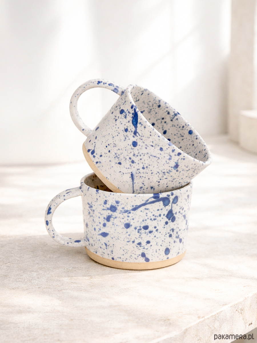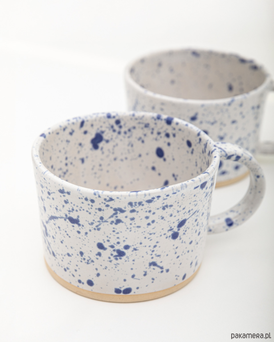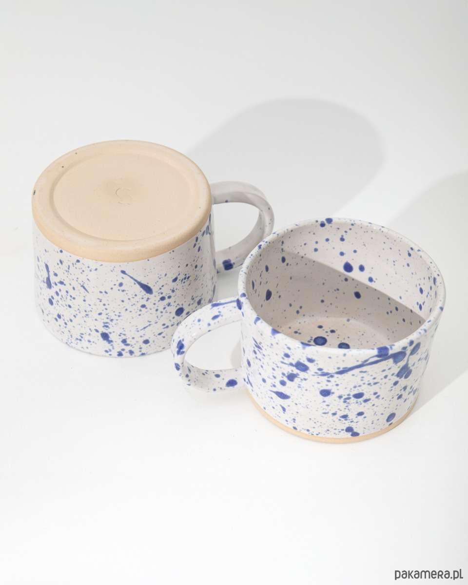 Kubek wykonany ręcznie z masy kamionkowej, pokryty białym szkliwem z charakterystycznym kobaltowym nakrapianiem. Każdy egzemplarz jest unikatowy – rozmieszczenie plamek i niuans koloru zawsze będą się nieznacznie różnić, co jest naturalnym efektem pracy ręcznej.