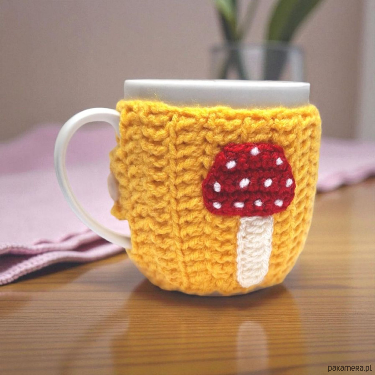 Kubeczek w ocieplaczu, ręcznie wykonany na szydełku z włóczki.
