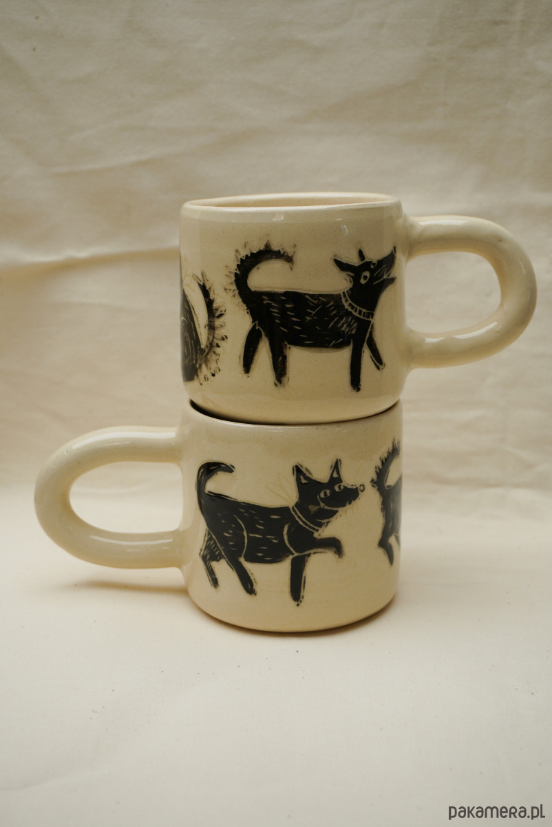 Duży kubek w białym kolorze z motywem zabawnych, czarnych piesków, wykonanych metodą sgraffito. Kubek został ręcznie wytoczony na kole garncarskim, a później ręcznie zdobiony. Ręczna produkcja sprawia, że żadna rzecz nie jest identyczna z drugą, co czyni ją wyjątkową.