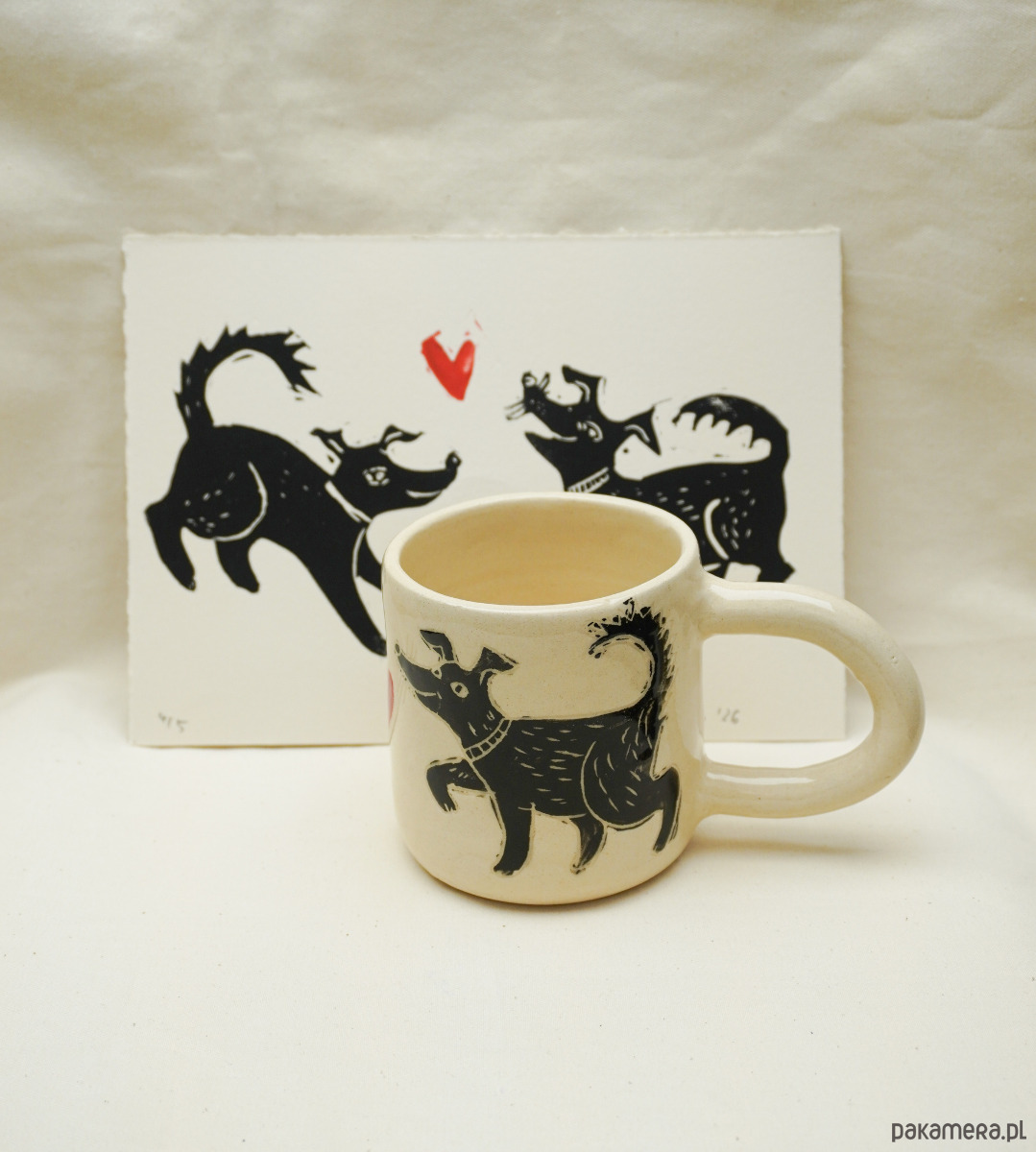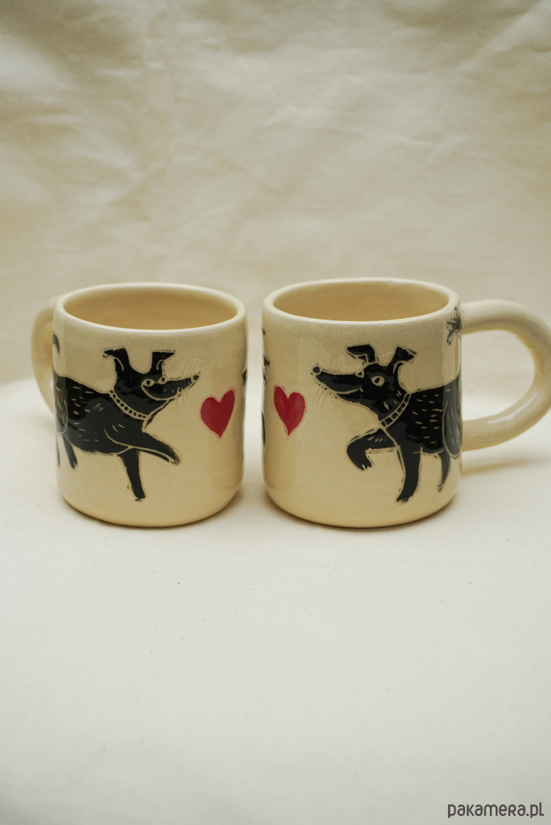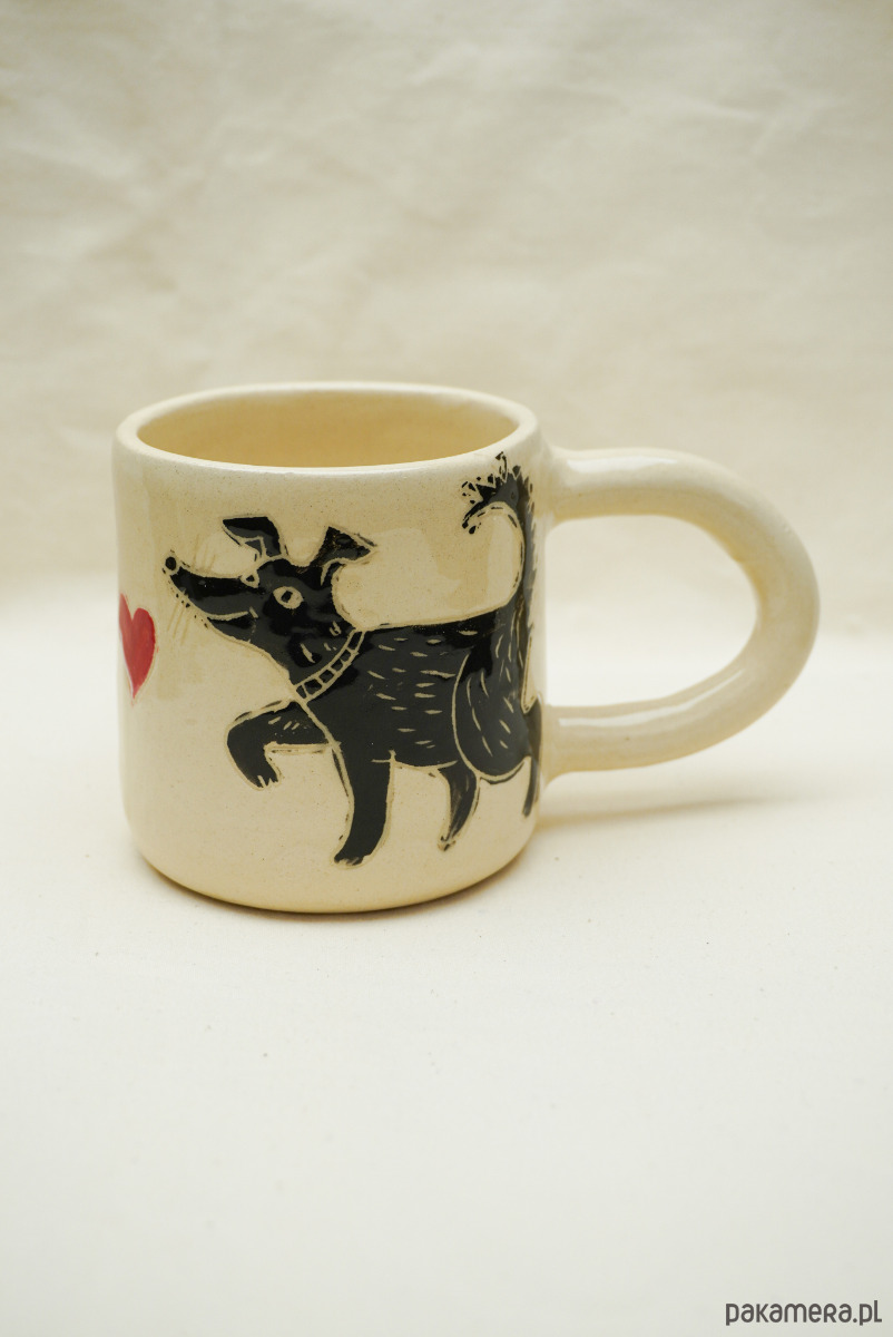 Jak herbata to tylko w naszych zabawnych kubkach z motywem figlarnych, zakochanych psów. Psy są czarne, a pomiędzy nimi czerwone serduszko. Wykonane z jasnej gliny, wytoczone na kole garncarskim i ozdobione ręcznie namalowanymi metodą sgraffito kotkami. To idealny wybór dla miłośników piesków i unikalnego rzemiosła. Czarka świetnie sprawdzi się do porannej kawy i herbaty.
