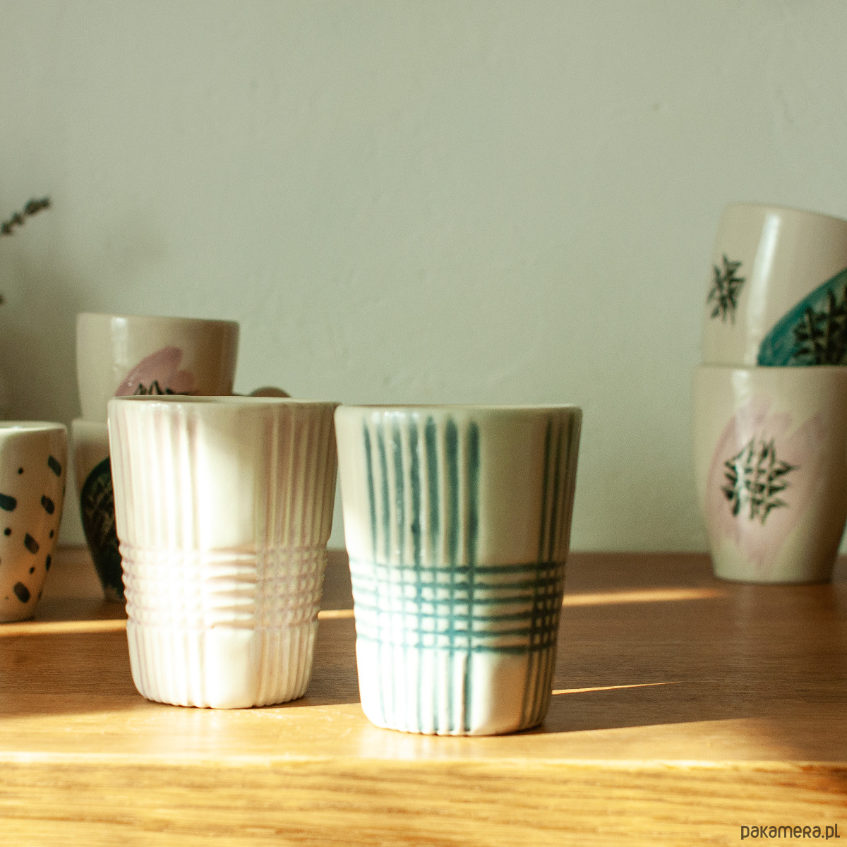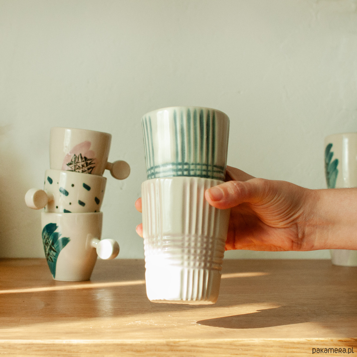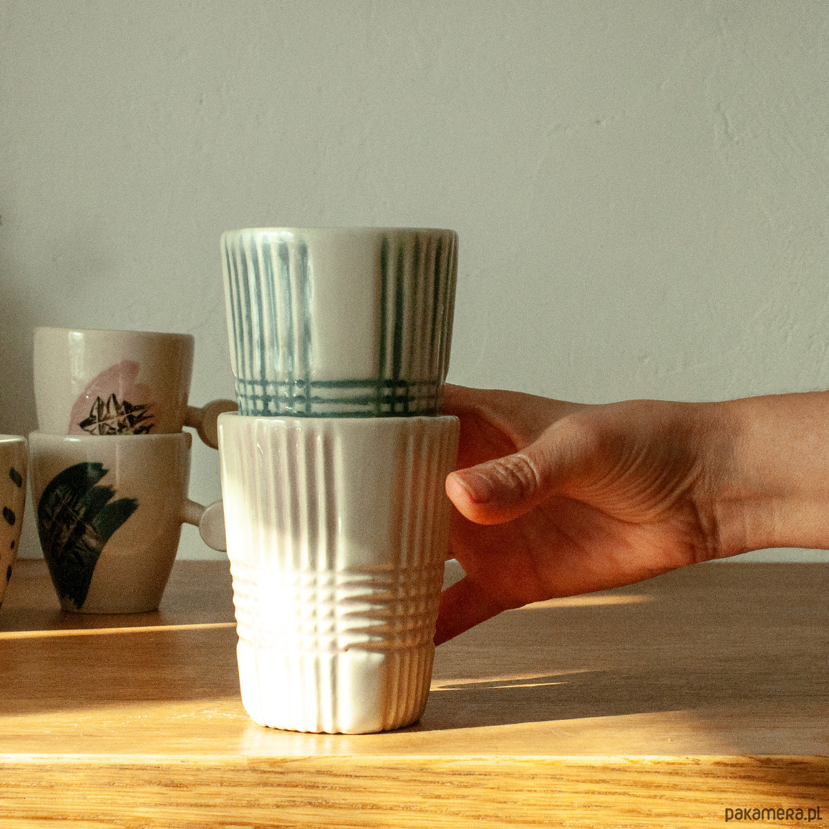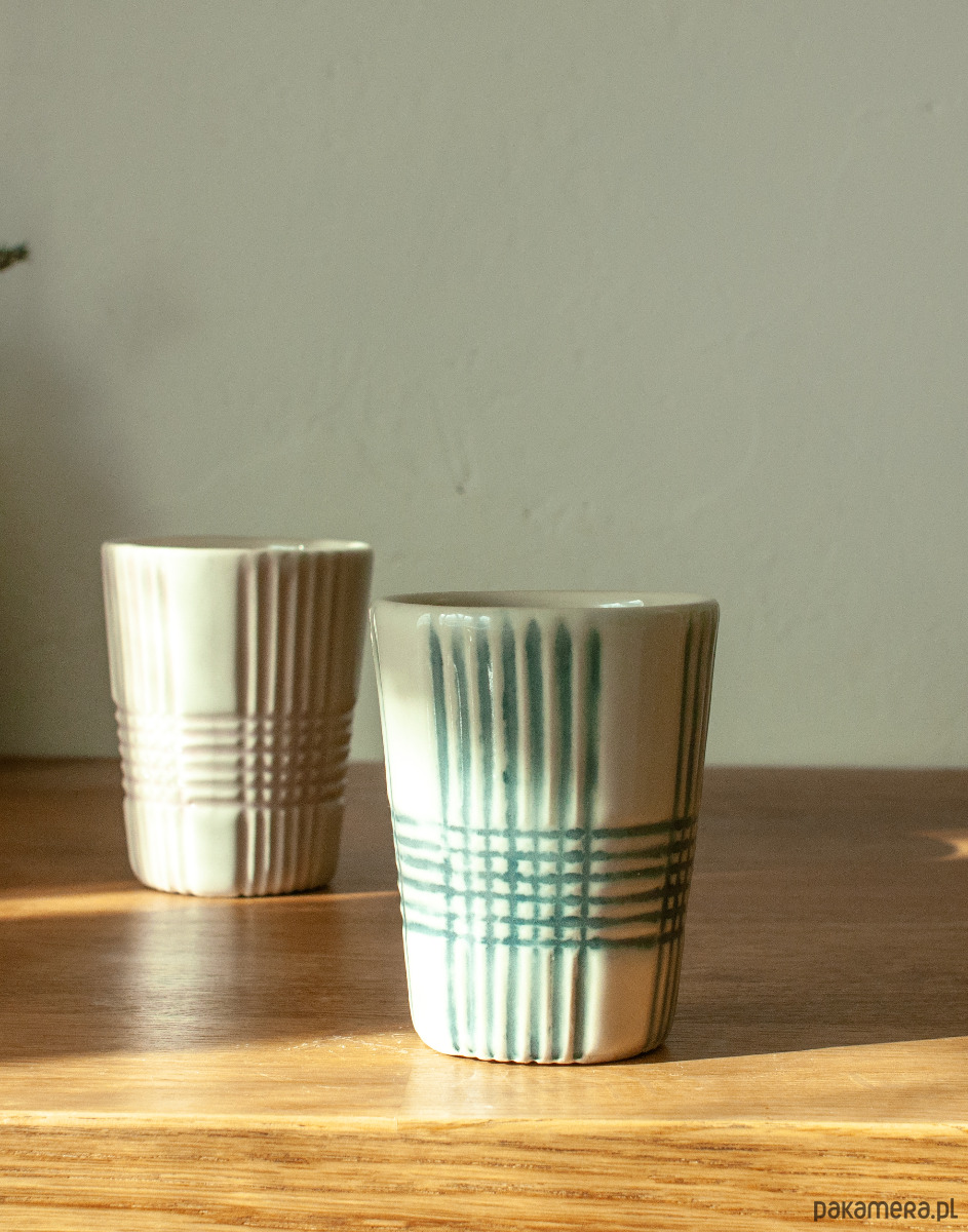 Punktem wyjścia jest fascynacja światłem, które w klasycznym krysztale odbija się i załamuje. W tym projekcie ten efekt zostaje odwrócony: zamiast refleksu, przenikania światła jest materiał, który pochłania światło, zatrzymuje i tłumi, zamieniając je w dotyk i fakturę. Bogata, geometryczna dekoracja może stać się zapisem cienia, a nie blasku. Ręcznie wykonany kubek z kamionki, stworzony z dbałością o każdy etap produkcji. Dzięki zastosowaniu techniki odlewu z form gipsowych oraz ręcznej obróbce, każdy jest inny, nie ma dwóch identycznych egzemplarzy.