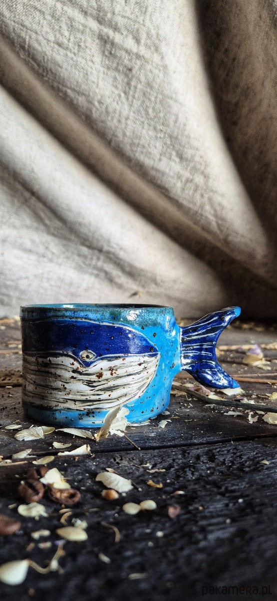 Kubek wieloryb, kubek rzeźbiony i ilustrowany wieloryb, humak kubek