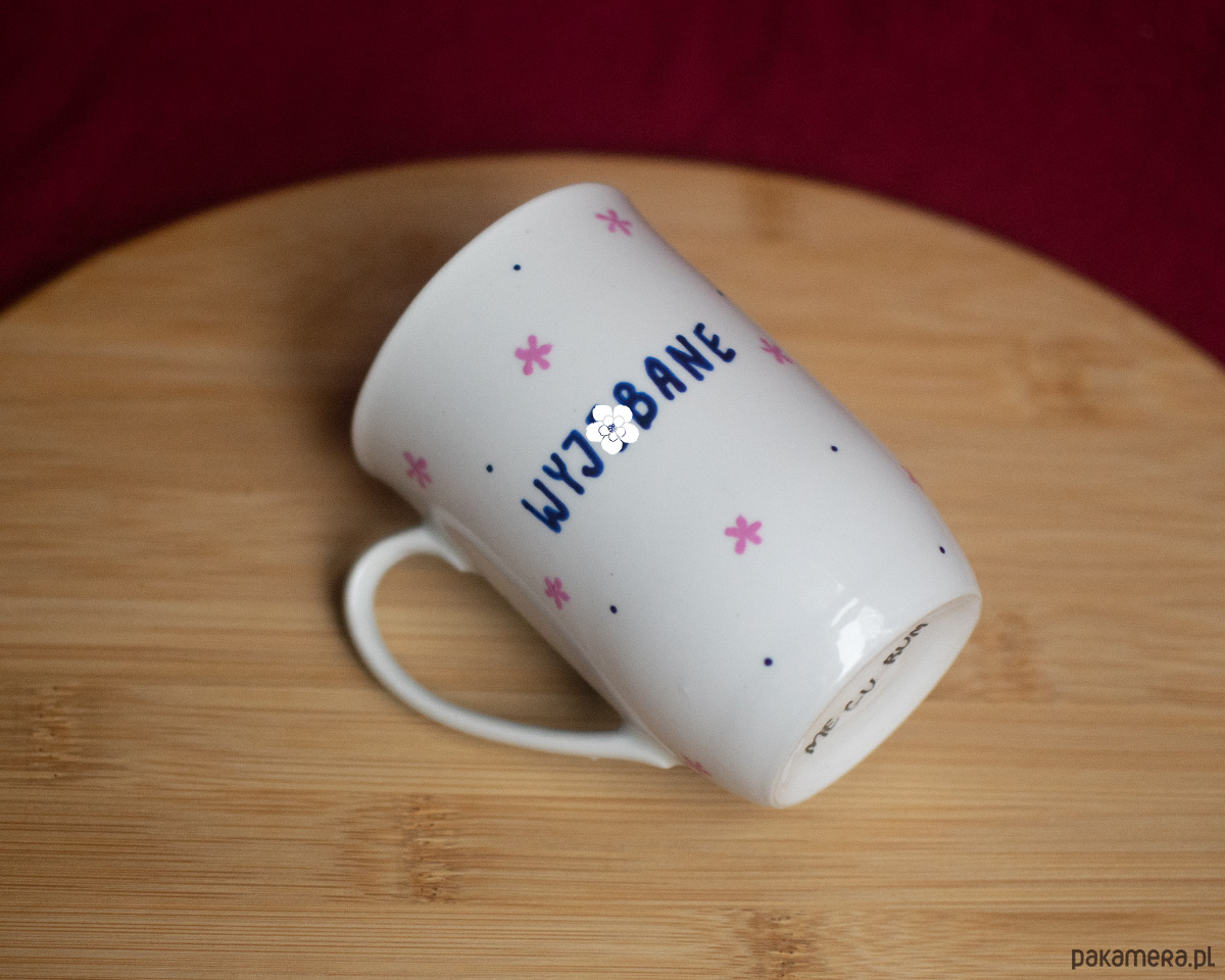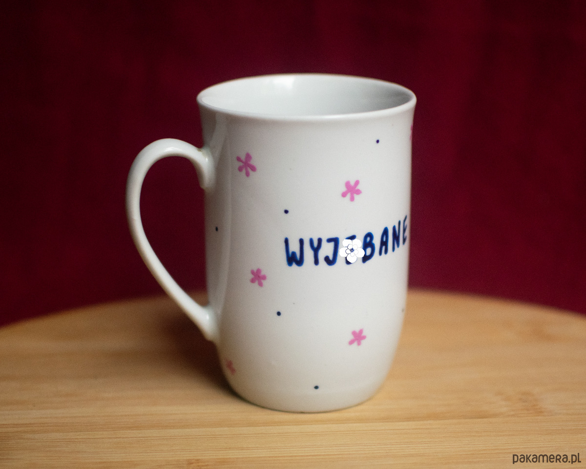 Ręcznie malowany biały kubek z drugiego obiegu. Ozdobiony brzydkim napisem oraz różowymi kwiatkami.