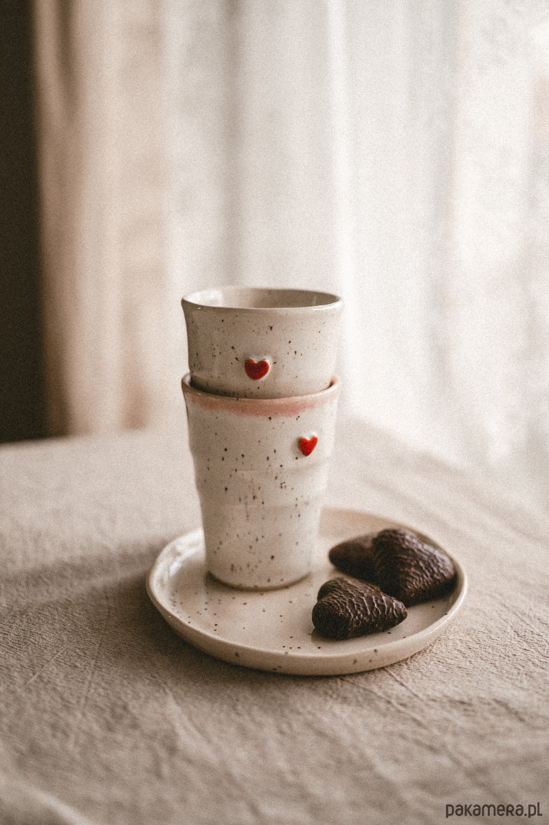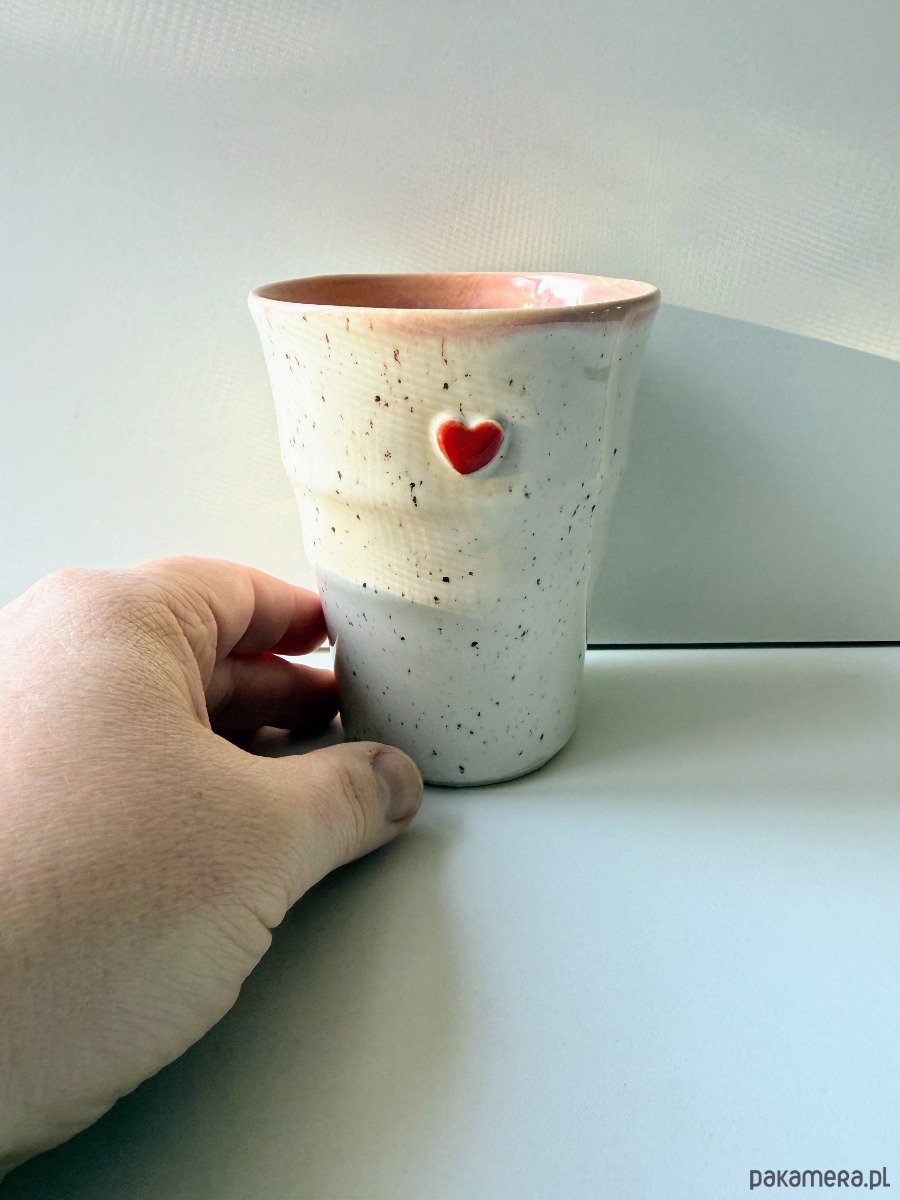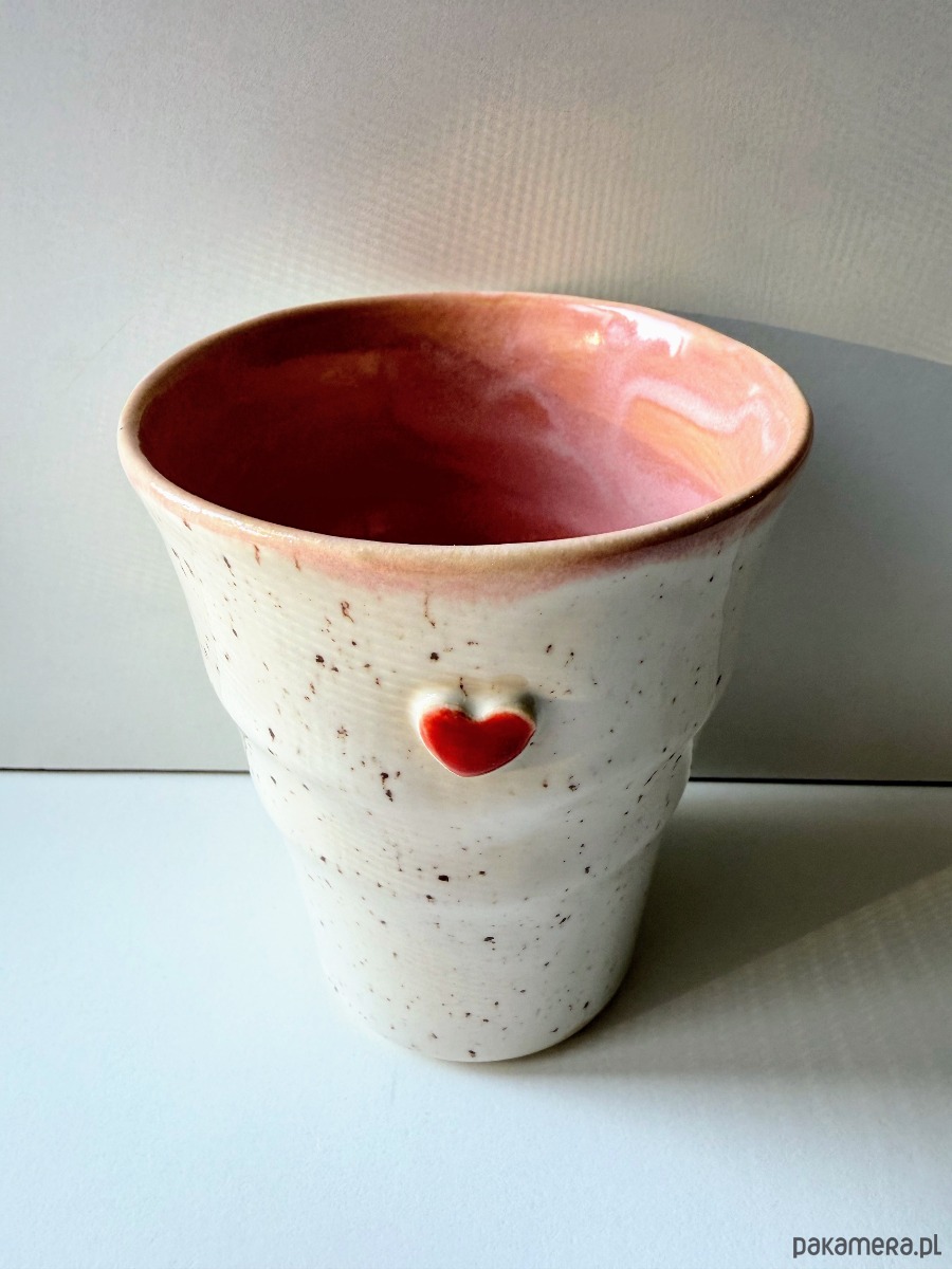 Wysoki kubek bez uchwytu z czerwonym serduszkiem, na zewnątrz szkliwo białe w piegi, wewnątrz różowe albo białe. Minimalistyczny, idealny na kawę, herbatę i inne napary.