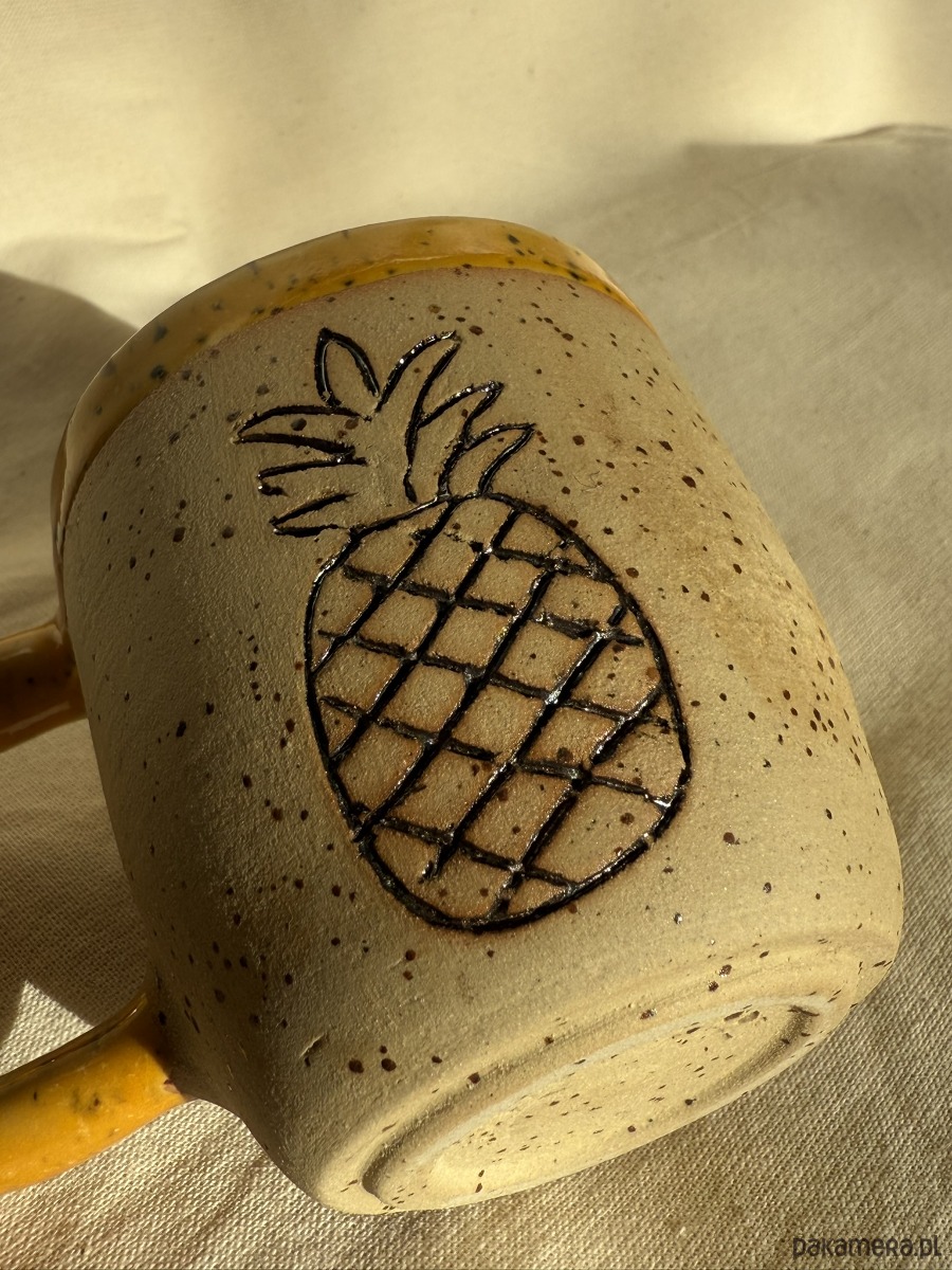 Ręcznie wykonany kubek z ceramiki, toczony na kole i wykończony z dbałością o każdy detal. Naturalna, jasna glina z delikatnym nakrapianiem tworzy ciepłe tło dla graficznego motywu ananasa, który został ręcznie wykonany i podkreślony ciemniejszą linią.