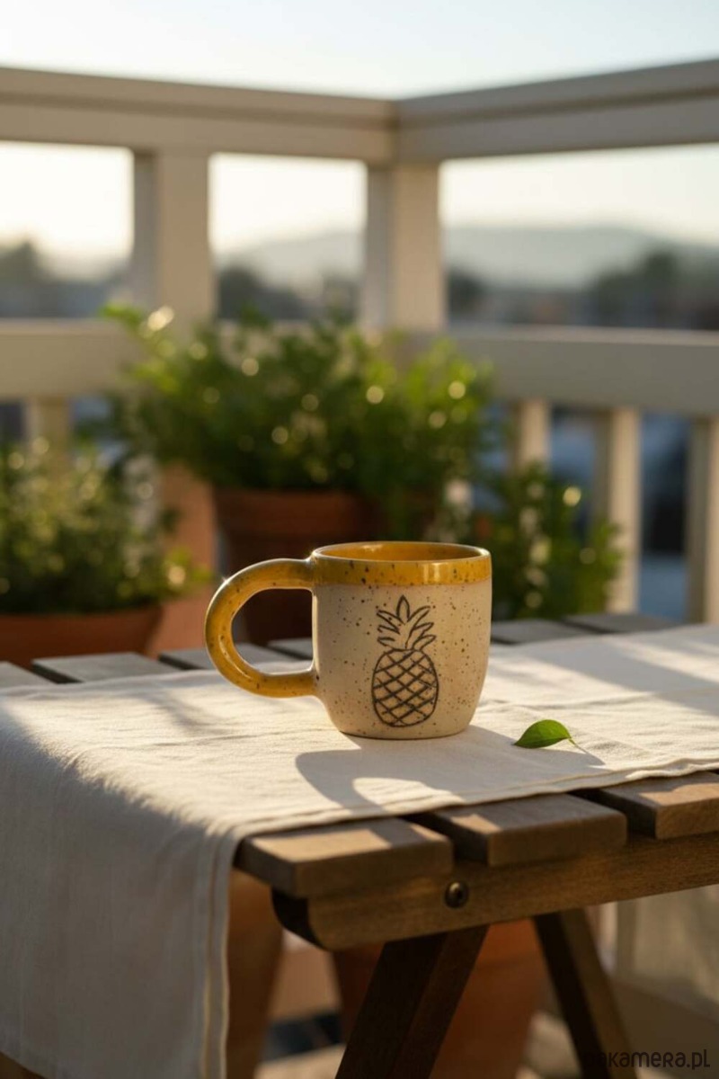 Kubek dobrze leży w dłoni, a wygodne ucho sprawia, że korzystanie z niego jest komfortowe. To przedmiot użytkowy, ale też dekoracyjny - wprowadza do wnętrza lekkość, słońce i odrobinę wakacyjnego klimatu.