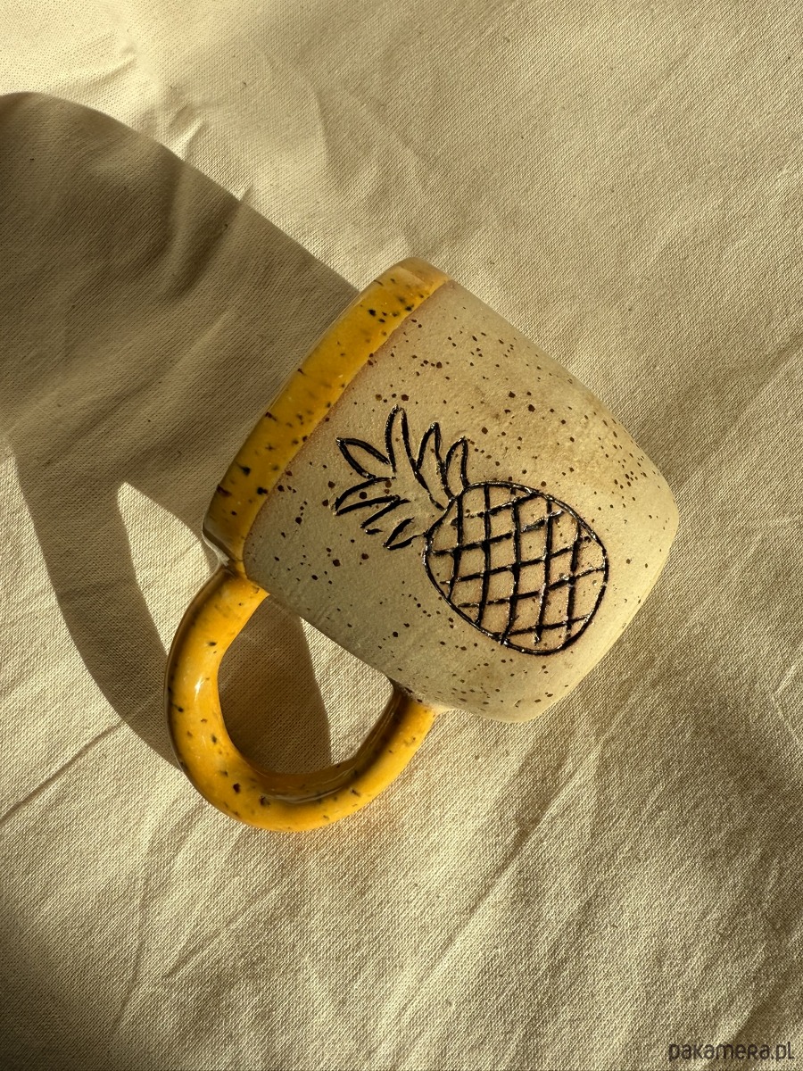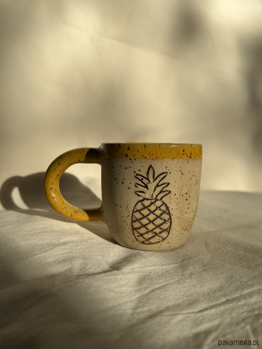 Kubek wytoczony na kole i wykończony z dbałością o każdy detal. Naturalna, jasna glina z delikatnym nakrapianiem tworzy ciepłe tło dla graficznego motywu ananasa, który został ręcznie wykonany i podkreślony ciemniejszą linią.