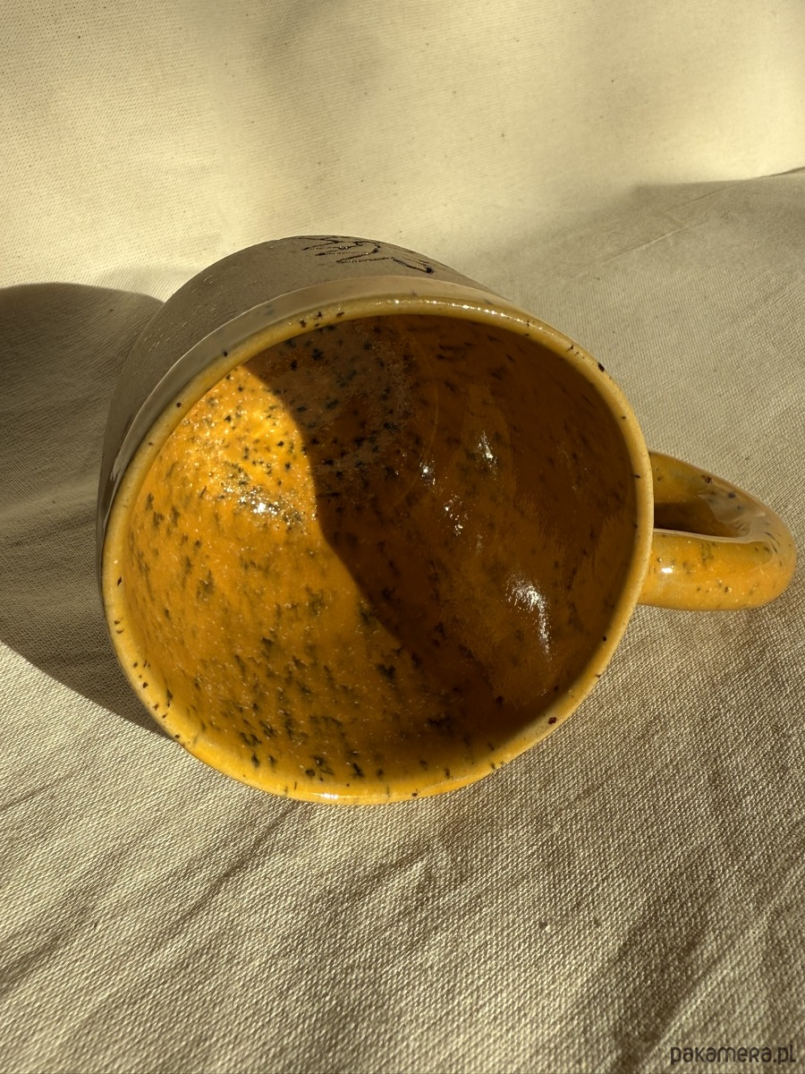 Górna krawędź oraz ucho pokryte są szkliwem w intensywnym, musztardowo-żółtym odcieniu. Kolor dodaje energii i charakteru, jednocześnie pięknie kontrastując z surową bazą kubka. Całość jest spójna, radosna i bardzo „codzienna” - idealna do porannej kawy lub herbaty.