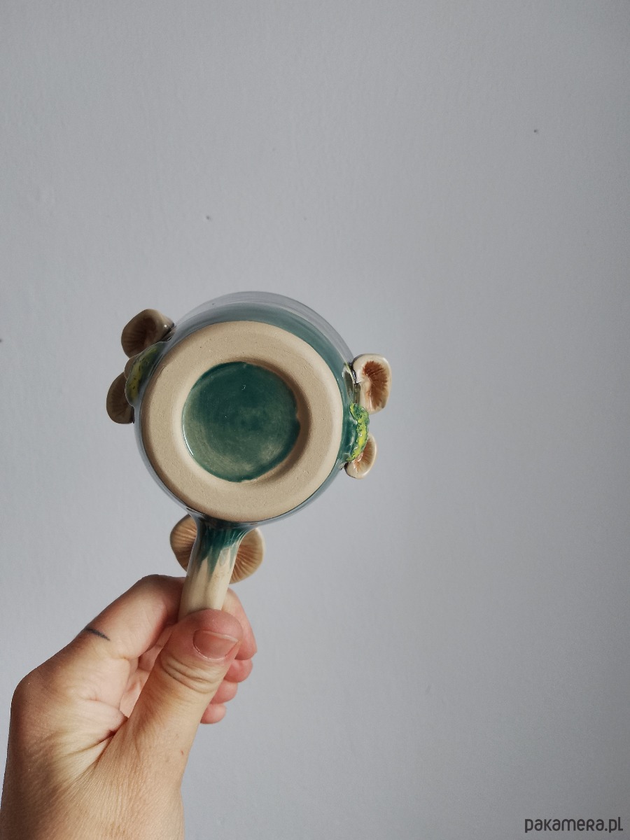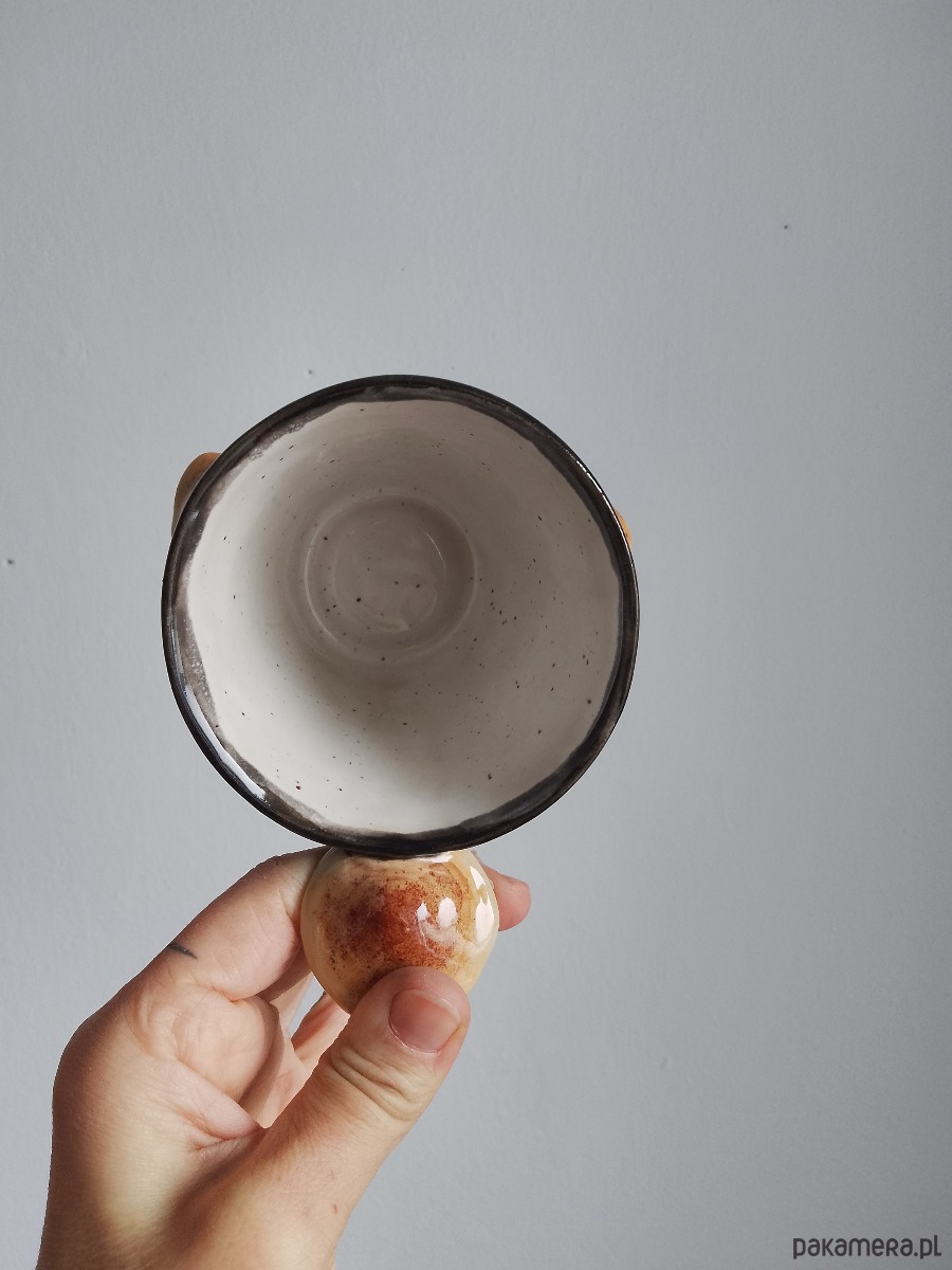 Kubek ceramiczny z uchem w kształcie grzybka o pojemności około 300 ml.
