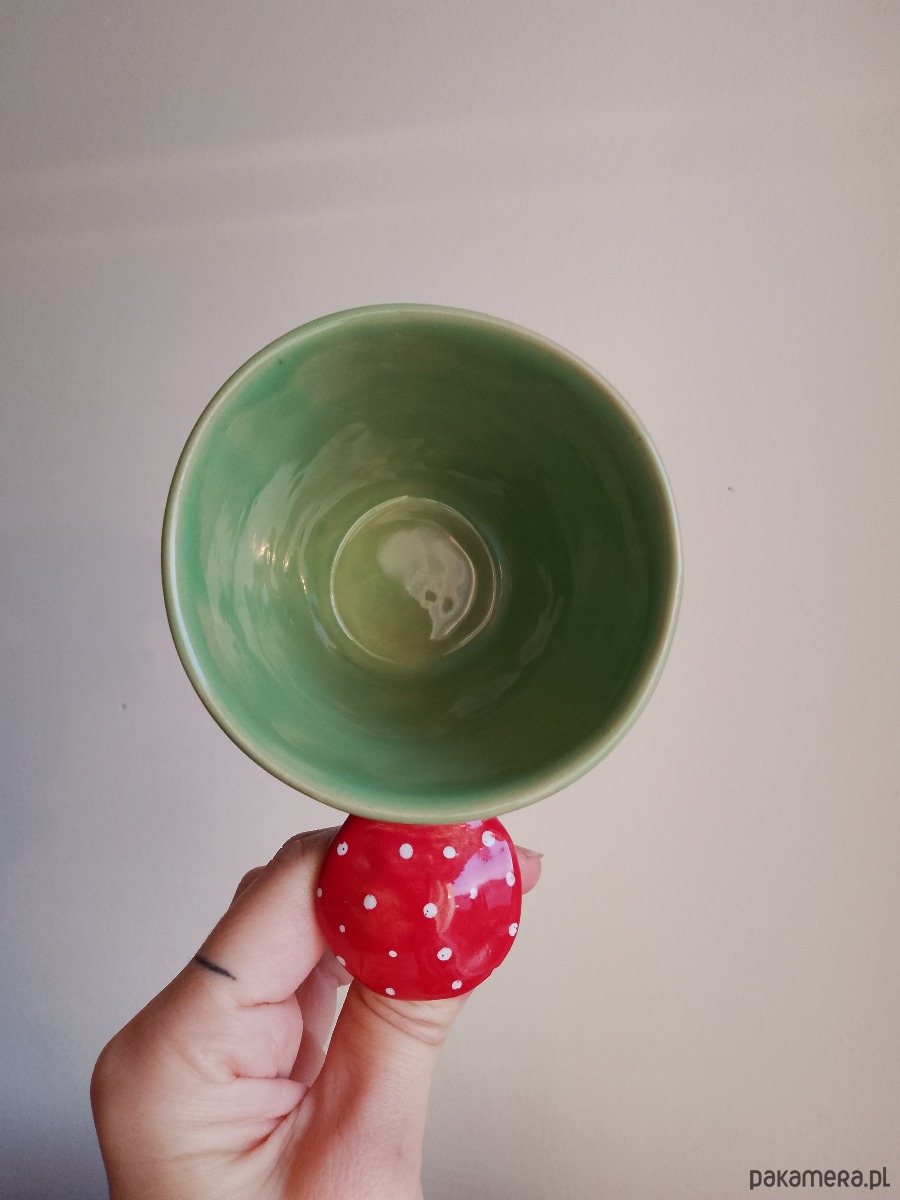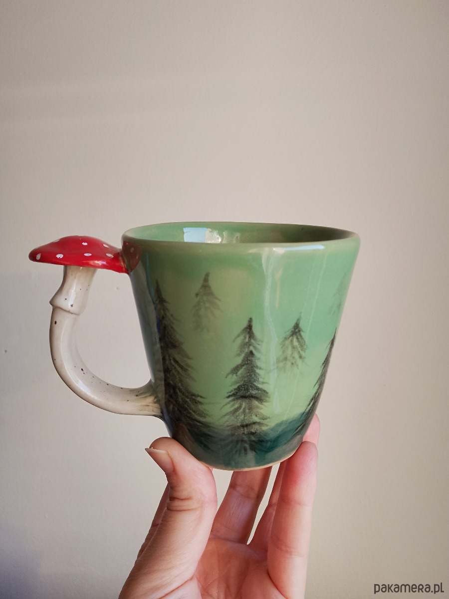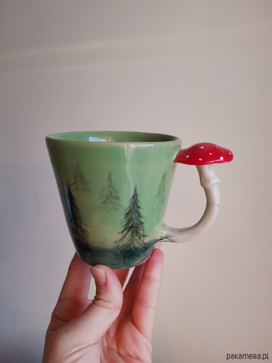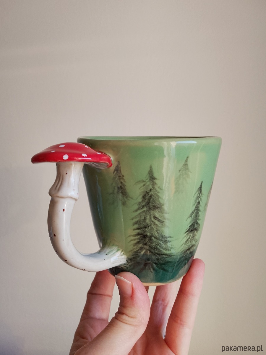 Kubek ceramiczny z uchem w kształcie grzybka .
