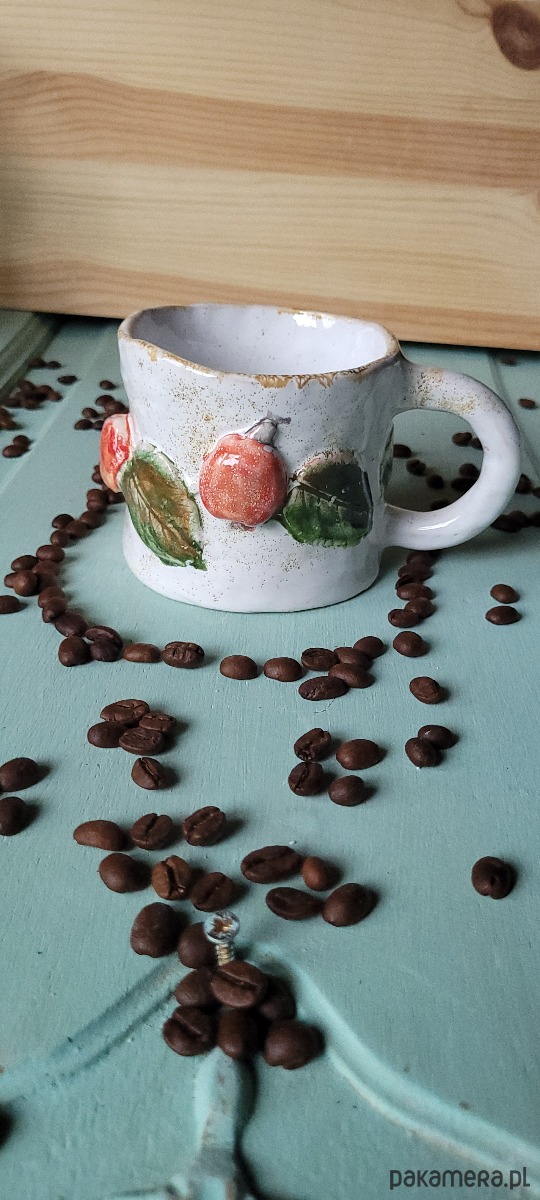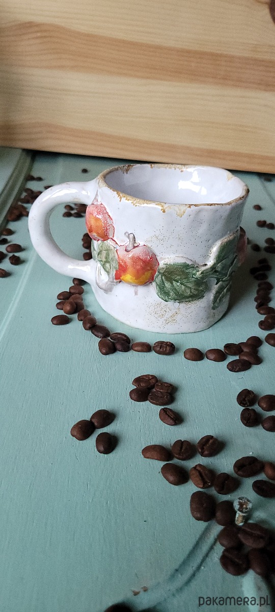 Ceramiczny kubek ręcznie formowany. Kubek z motywem Januszek. Kolory jesieni na pięknym białym szkliwie.