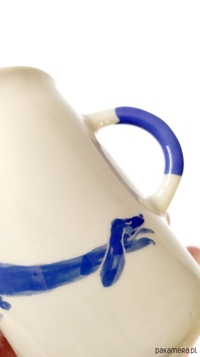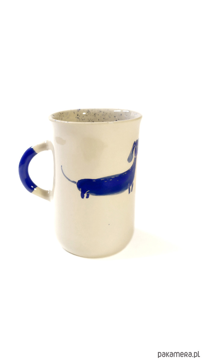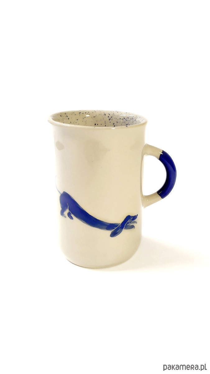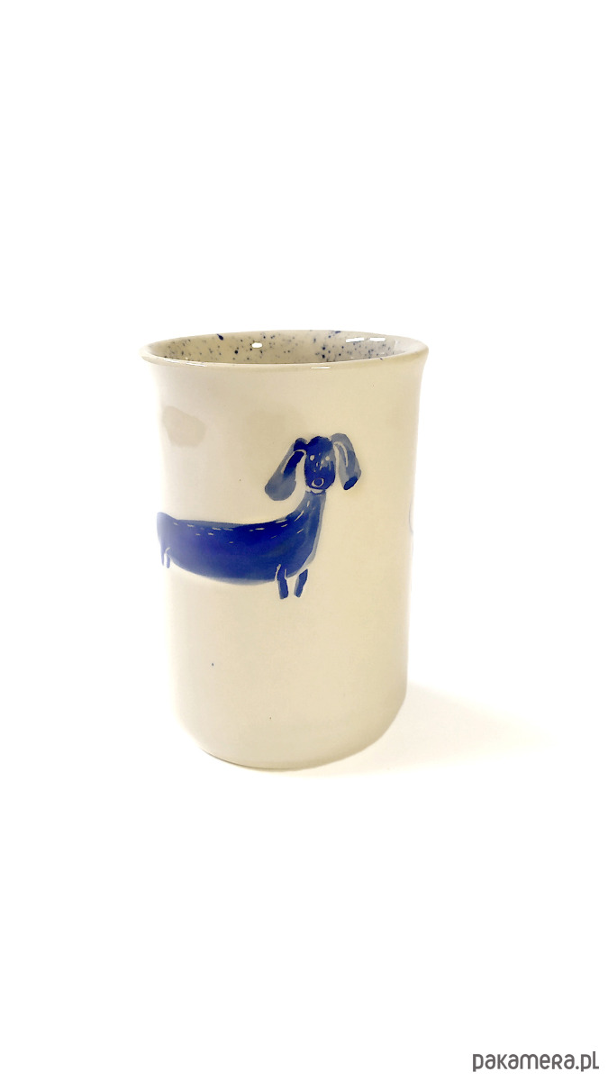 Kubeczek z jamniczkami, motyw malowany ręcznie niebieskimi farbami podszkliwnymi, wnętrze kubka nakrapiane w niebieskim kolorze, wykonany z wysokiej jakości kremowej gliny, 100% handmade. Szkliwiony transparentnym szkliwem. Sygnowany. Kubeczek można myć w zmywarce.