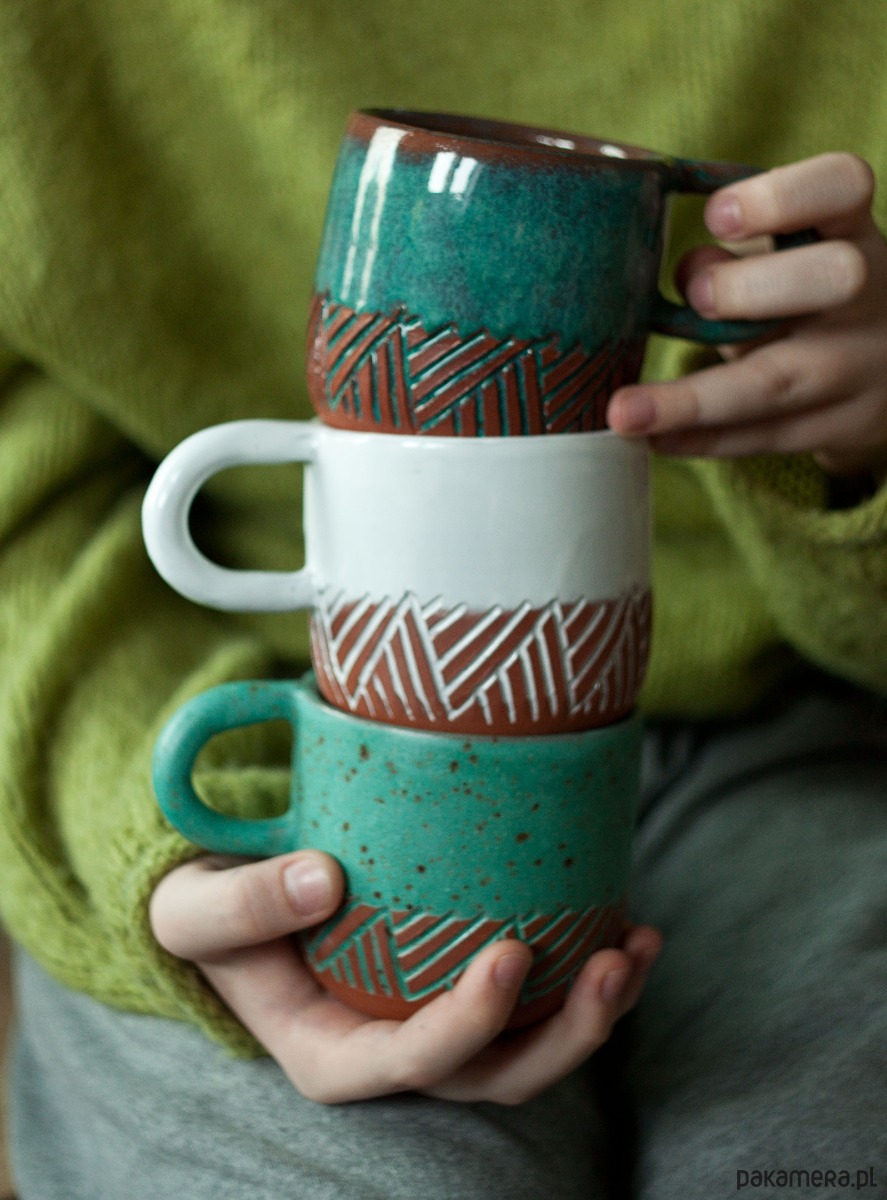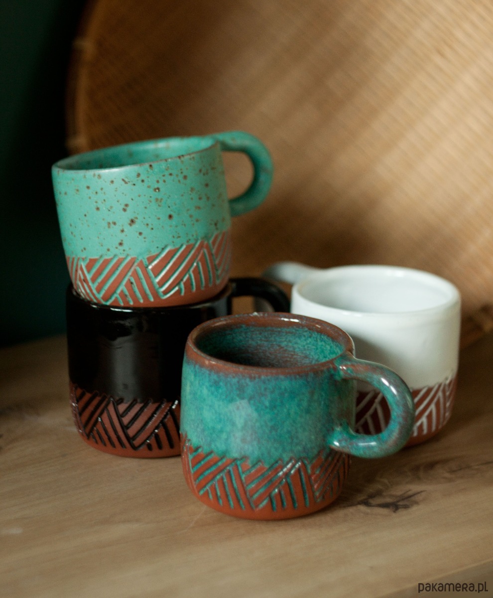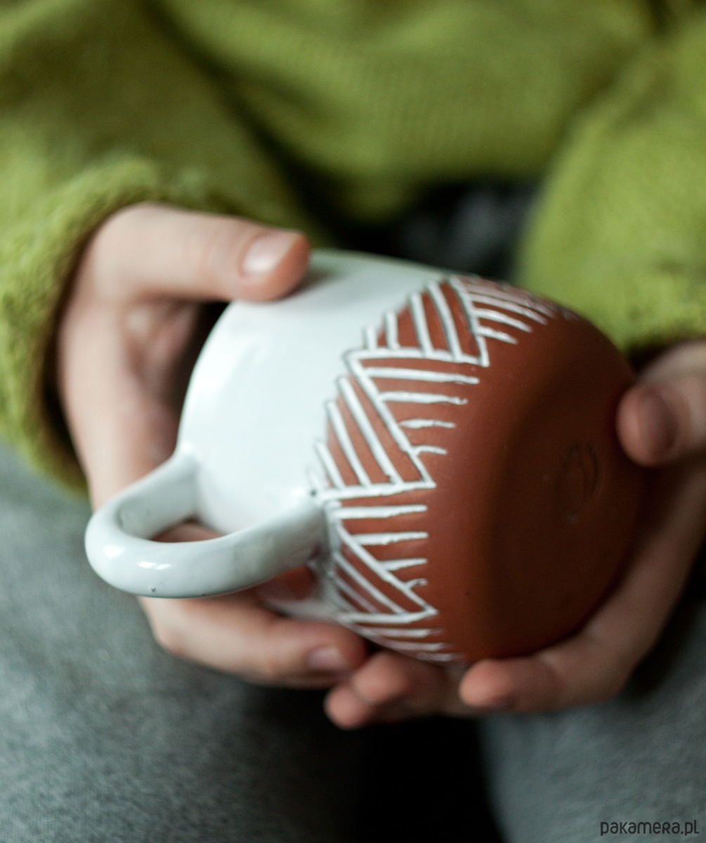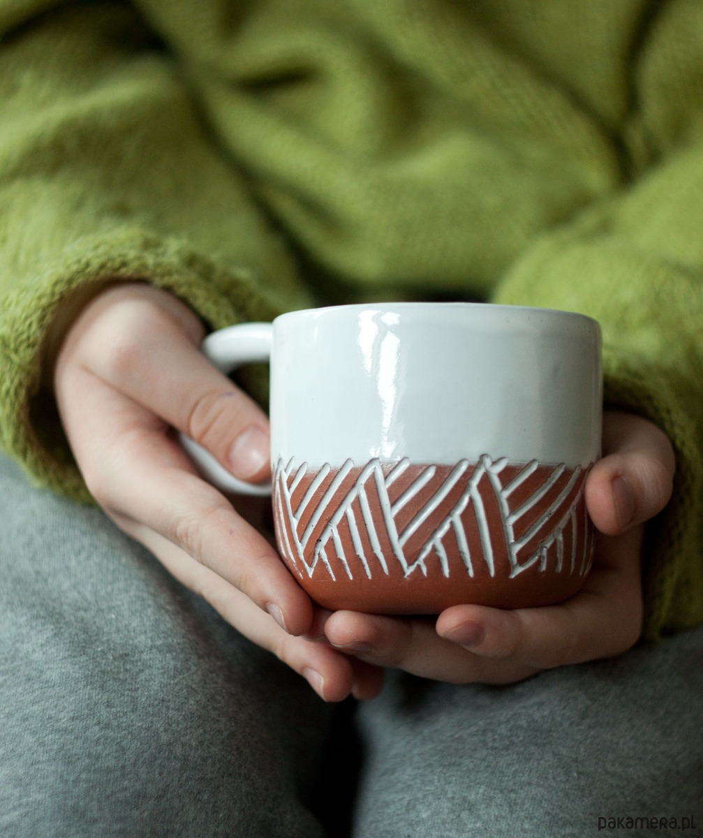 Kubek ceramiczny wytoczony na kole garncarskim. Ręcznie zdobiony nacięciami w jodełkę. Zrobiłam go z naturalnej gliny garncarskiej. Szkliwiony jest białym szkliwem. Na spodzie kubka logo pracowni. Pojemność 270 ml. Ma poręczne ucho, nadaje się do kontaktu z żywnością i został wykonany z bezpiecznych materiałów. Fajny kontrast między szkliwem a surową rudą gliną nadaje mi etnicznego charakteru.