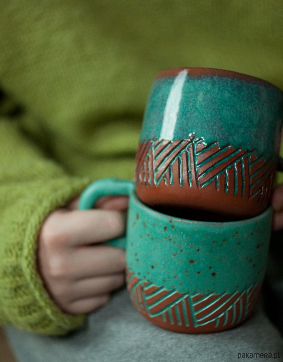 Kubek ceramiczny wytoczony na kole garncarskim. Ręcznie zdobiony nacięciami w jodełkę. Zrobiłam go z naturalnej gliny garncarskiej. Szkliwiony jest zielonym szkliwem. Na spodzie kubka logo pracowni. Pojemność 270 ml. Ma poręczne ucho, nadaje się do kontaktu z żywnością i został wykonany z bezpiecznych materiałów. Fajny kontrast między szkliwem a surową rudą gliną nadaje mi etnicznego charakteru.