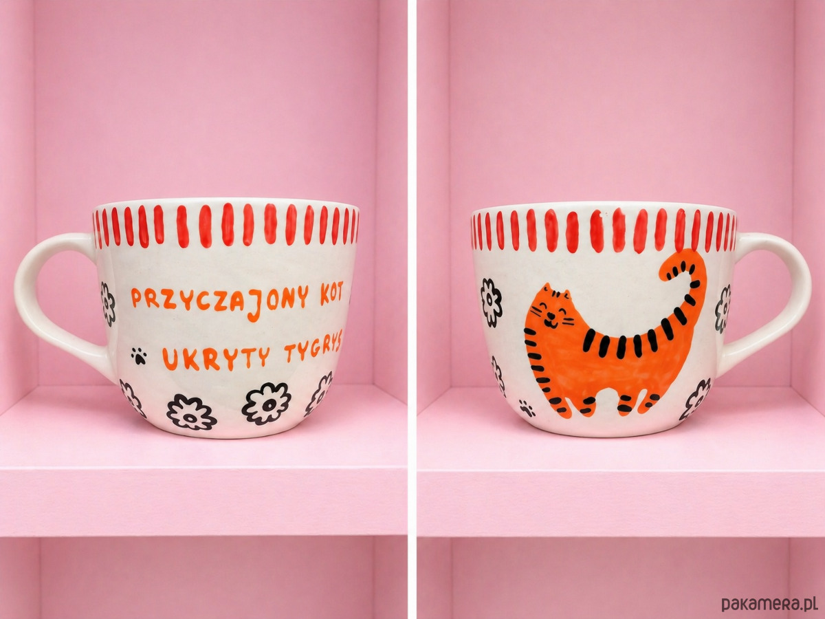 Kubek z motywem kociego łobuza, czasem niezdarnego, któremu w sercu tygrys dyktuje warunki. Skrada się niczym jeden z największych drapieżników świata, potrącając wszystko na swojej drodze robiąc przy tym masę hałasu.