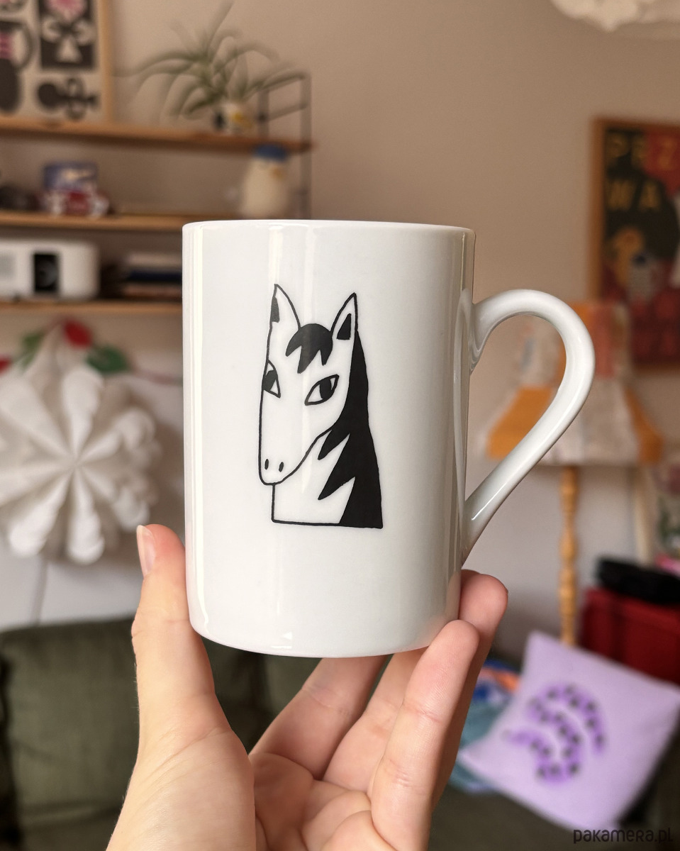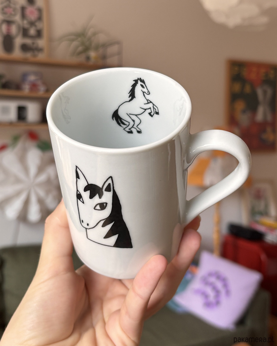 Ręcznie zdobiony ceramiczny kubek z drugiego obiegu. Kubek z koniem