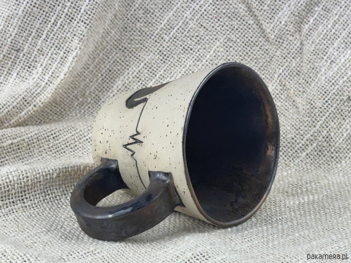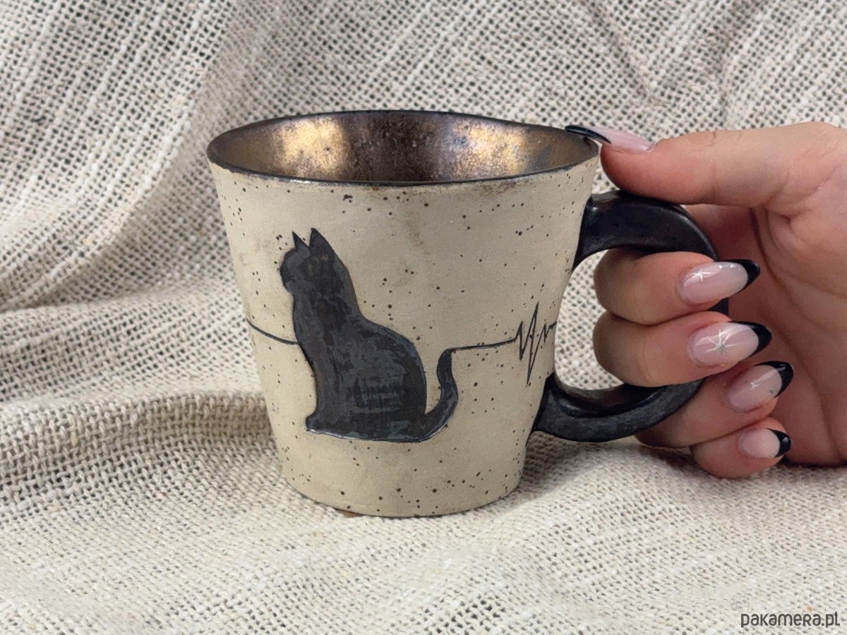Unikatowy, ręcznie wykonany kubek ceramiczny ozdobiony subtelną sylwetką kota.