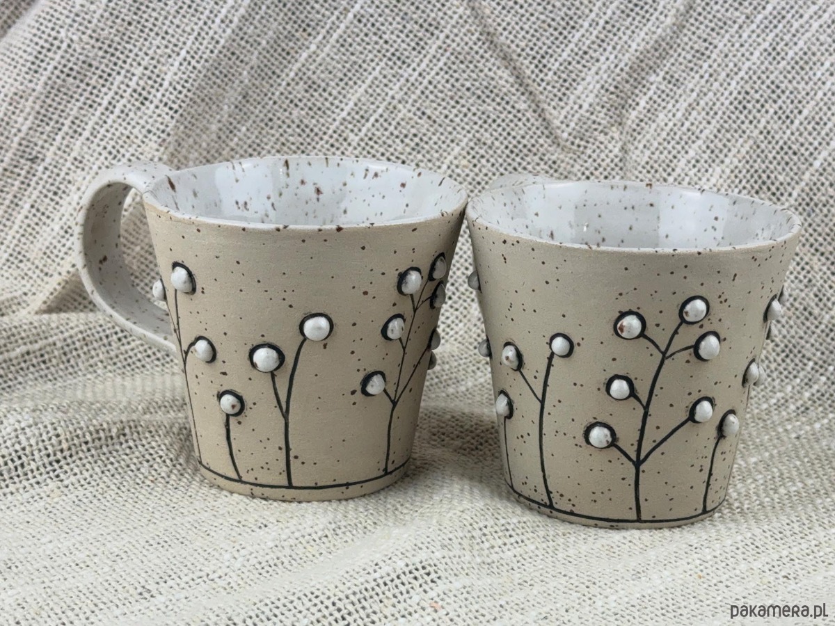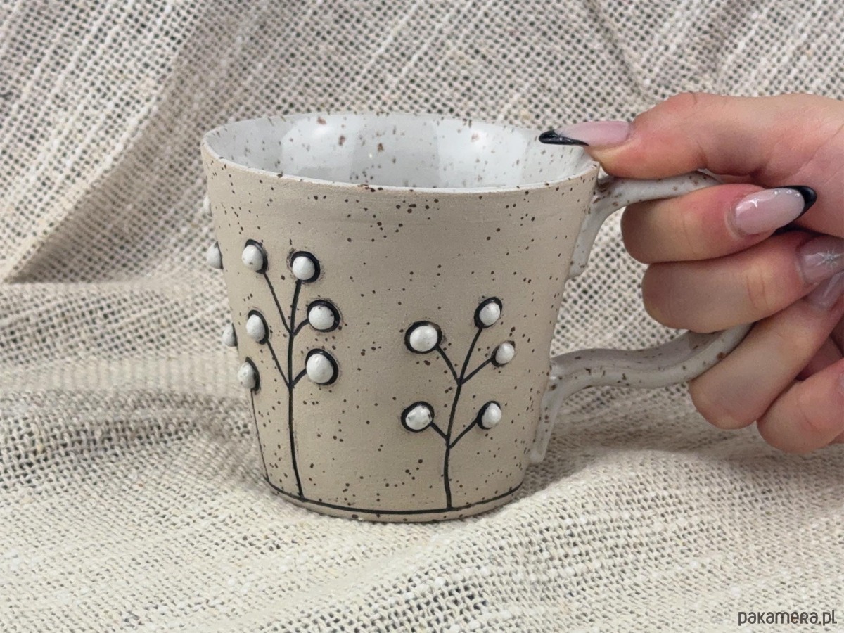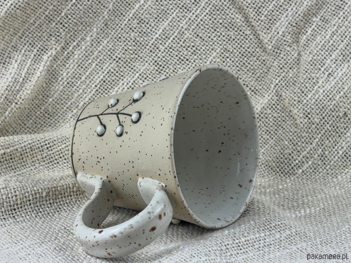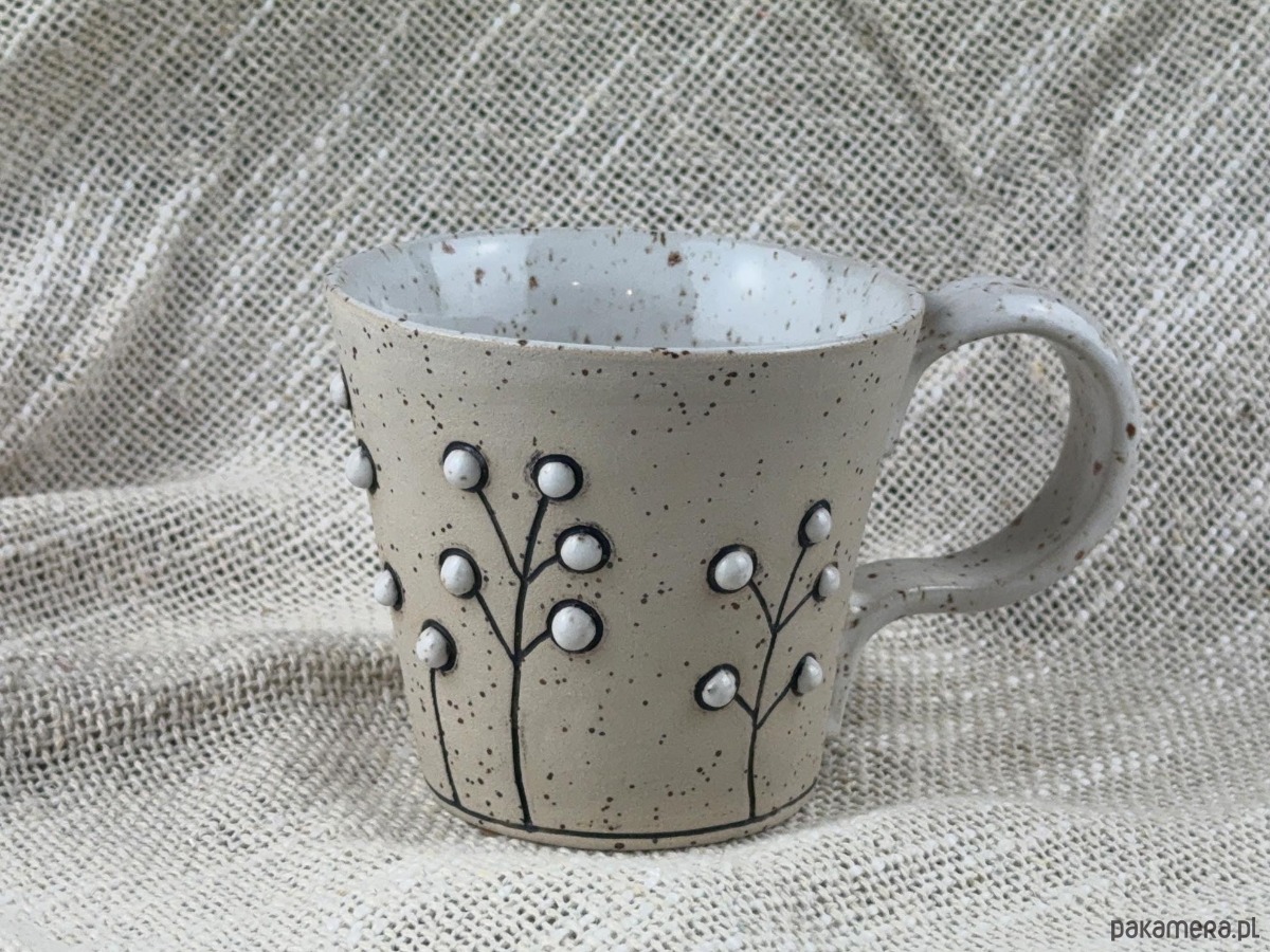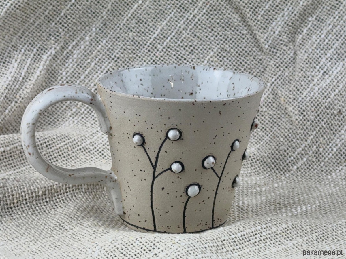 Kubek ceramiczny z wklęsłymi gałązkami i wypukłymi białymi kuleczkami.