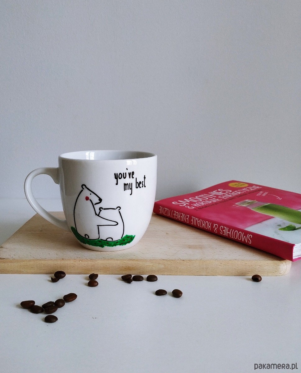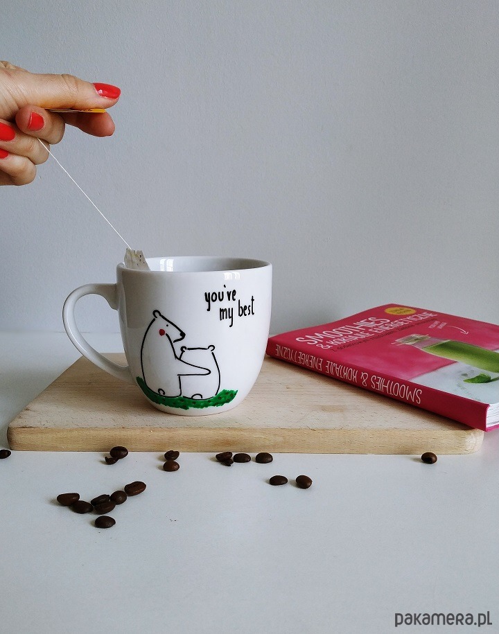 Ręcznie malowany, porcelanowy kubek o pojemności 300 ml.