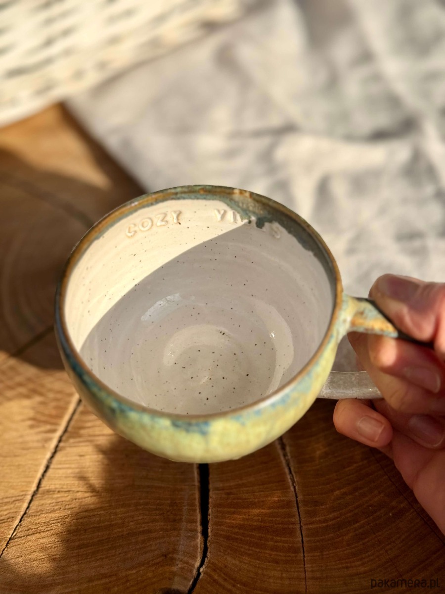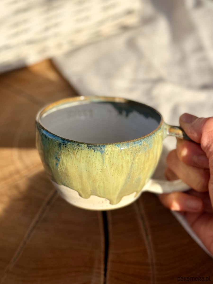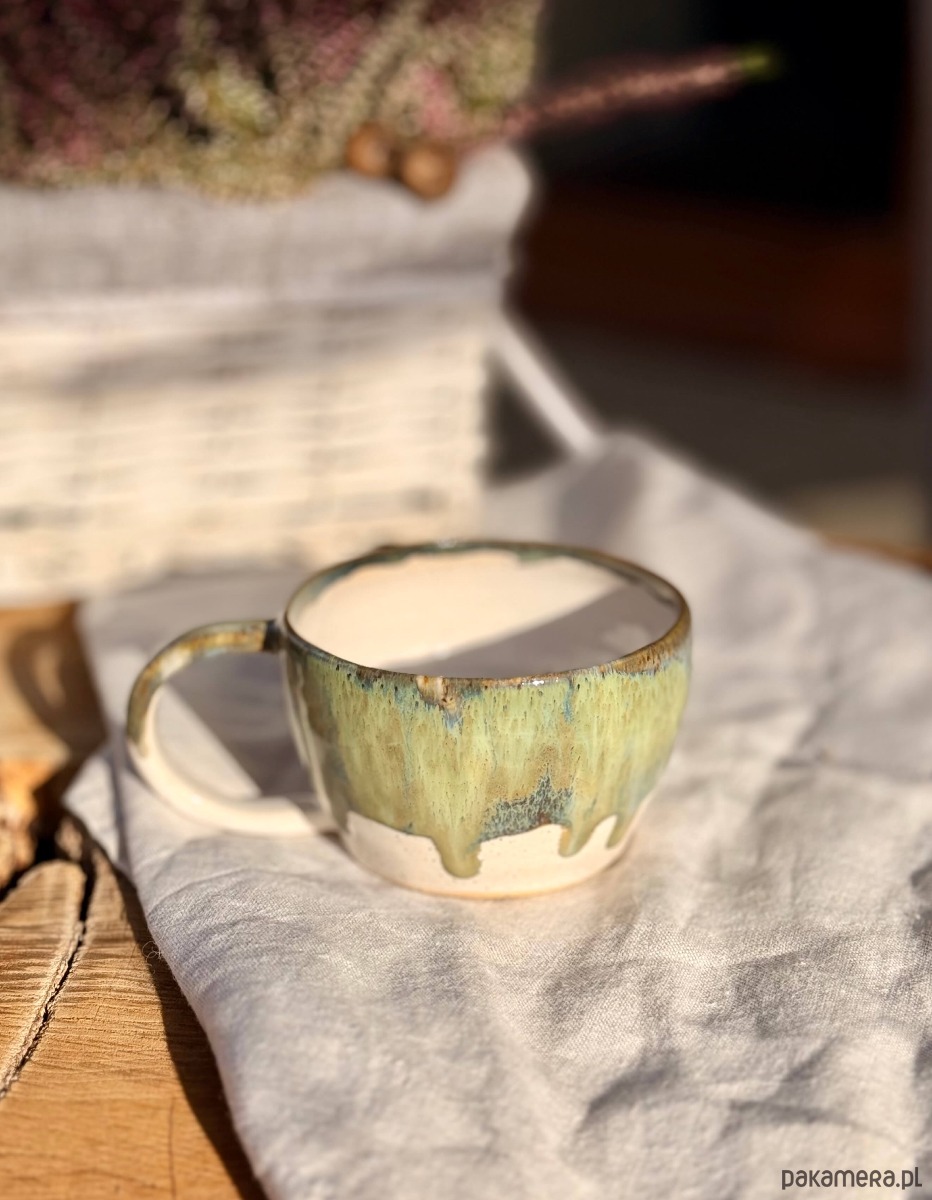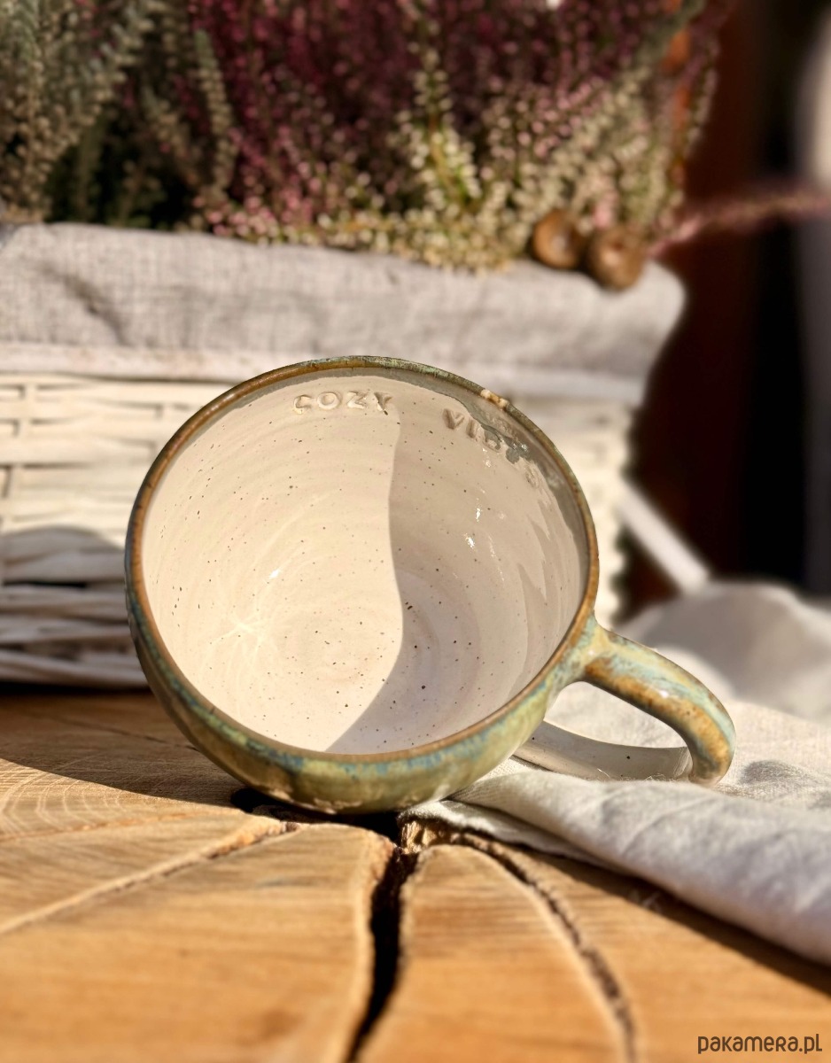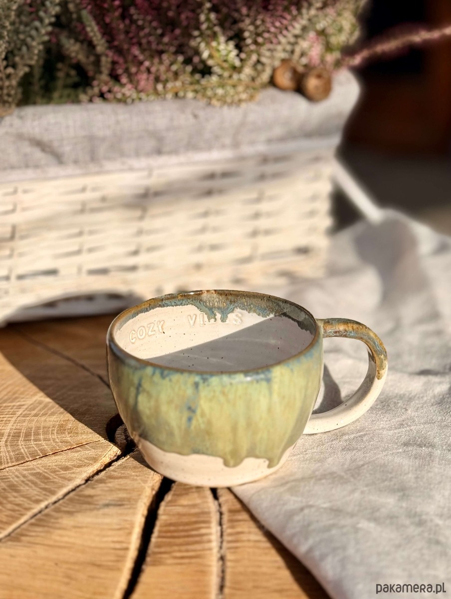 Kubek został wytoczony na kole garncarskim z miłością i lekką obsesją na punkcie dobrej kawy i herbaty.