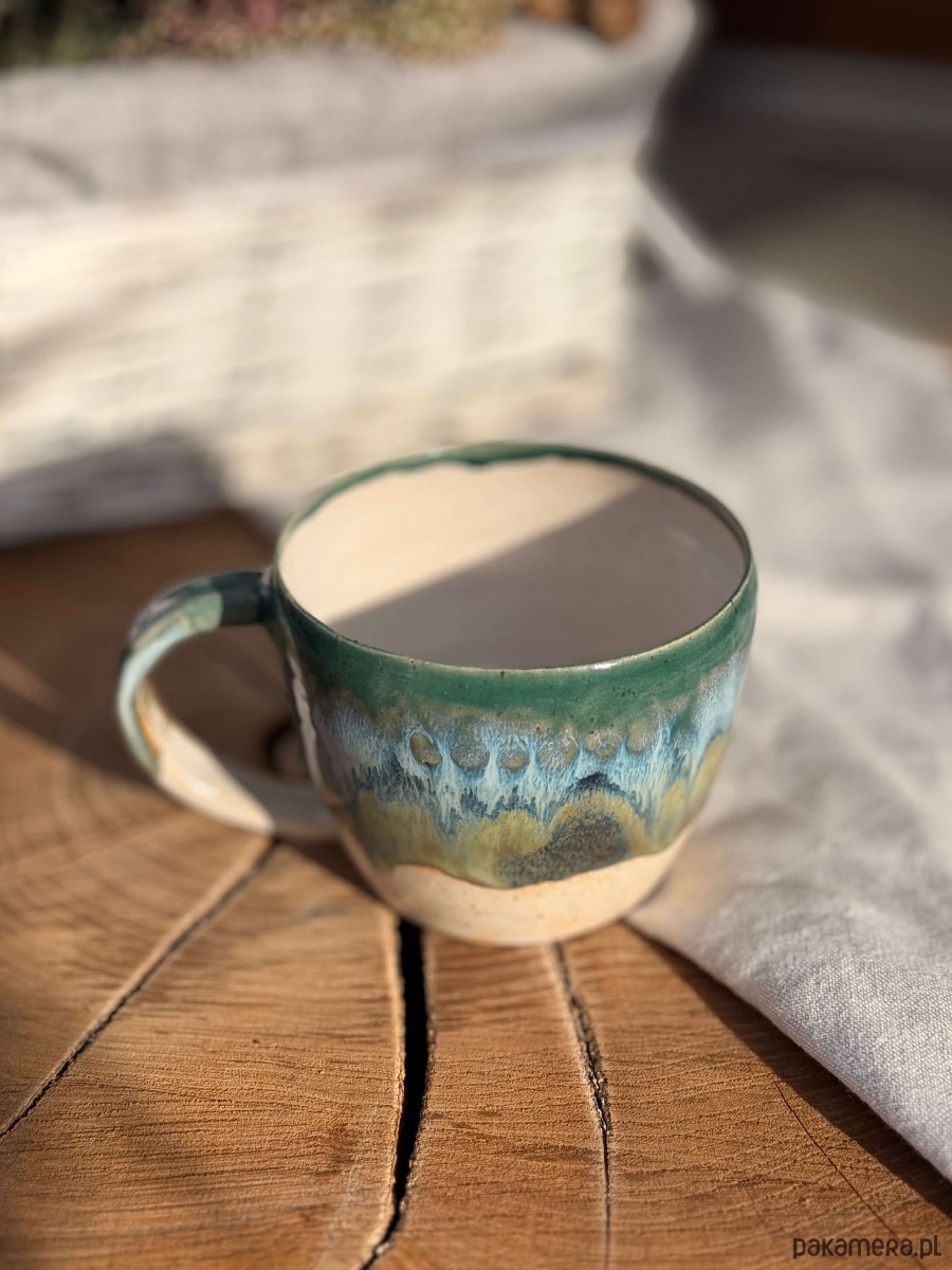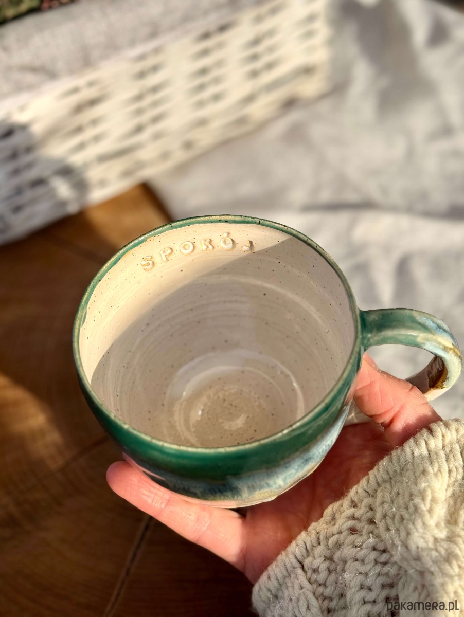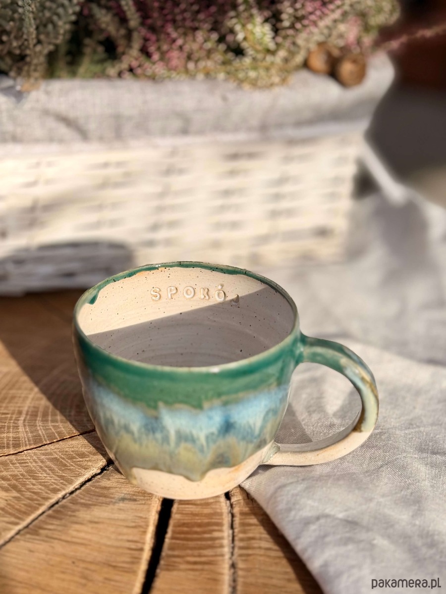 Kubek został wytoczony na kole garncarskim z miłością i lekką obsesją na punkcie dobrej kawy i herbaty.