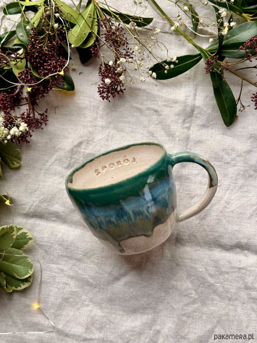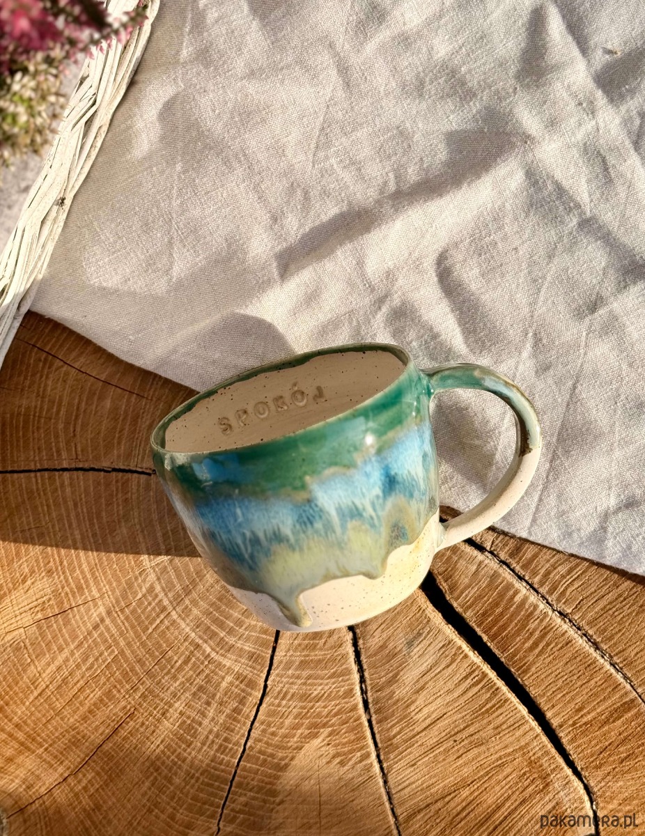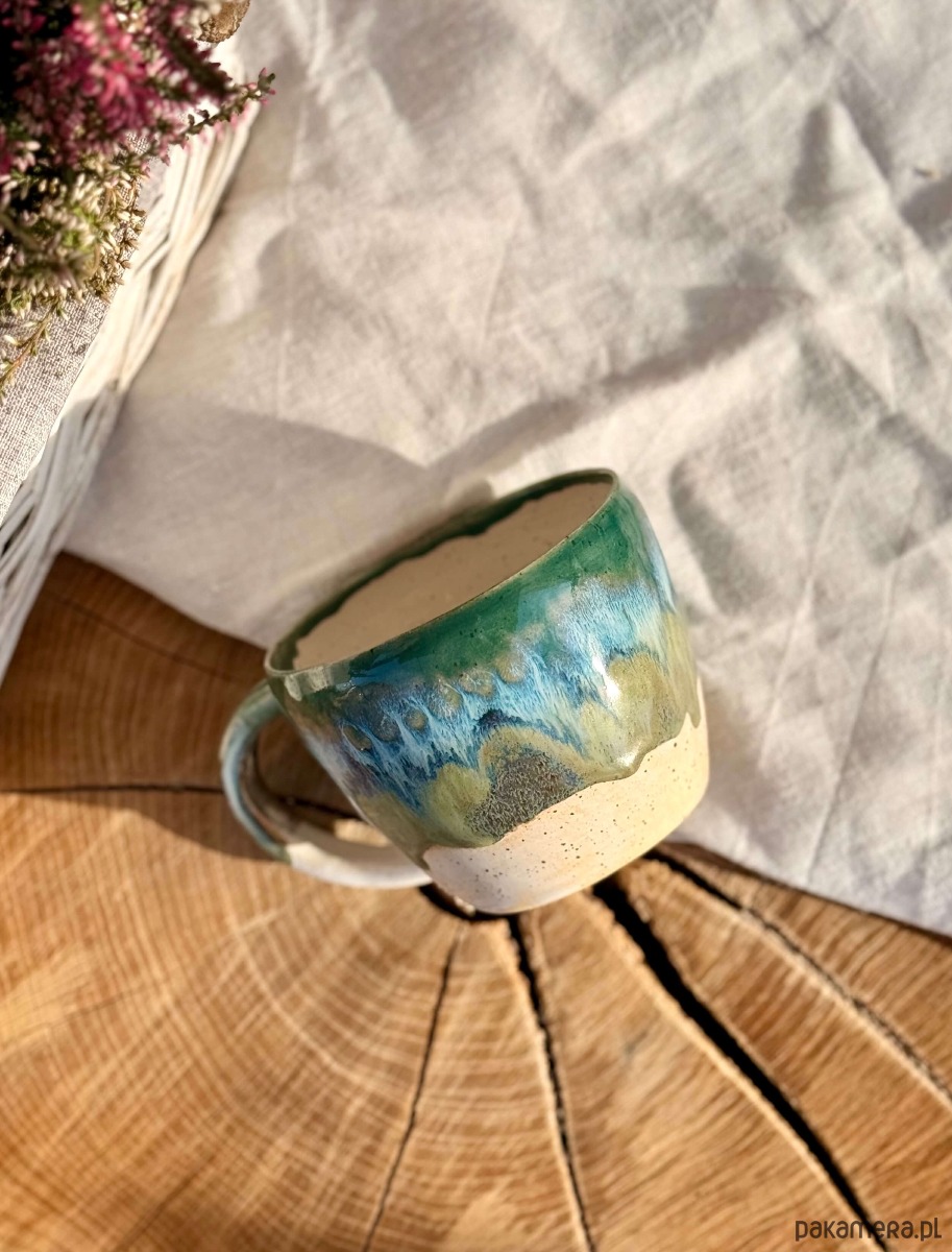 Kubek został wytoczony na kole garncarskim z miłością i lekką obsesją na punkcie dobrej kawy i herbaty.