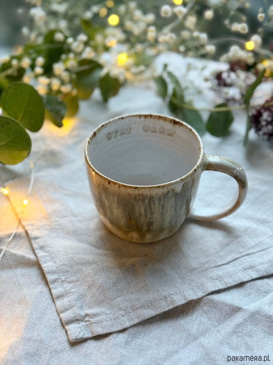 Kubek ceramiczny z napisem STAY WARM, o pojemności 280ml, z kolekcji COZY MOMENTS - na Twoje przytulne chwile.