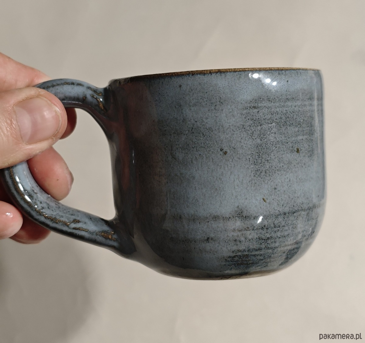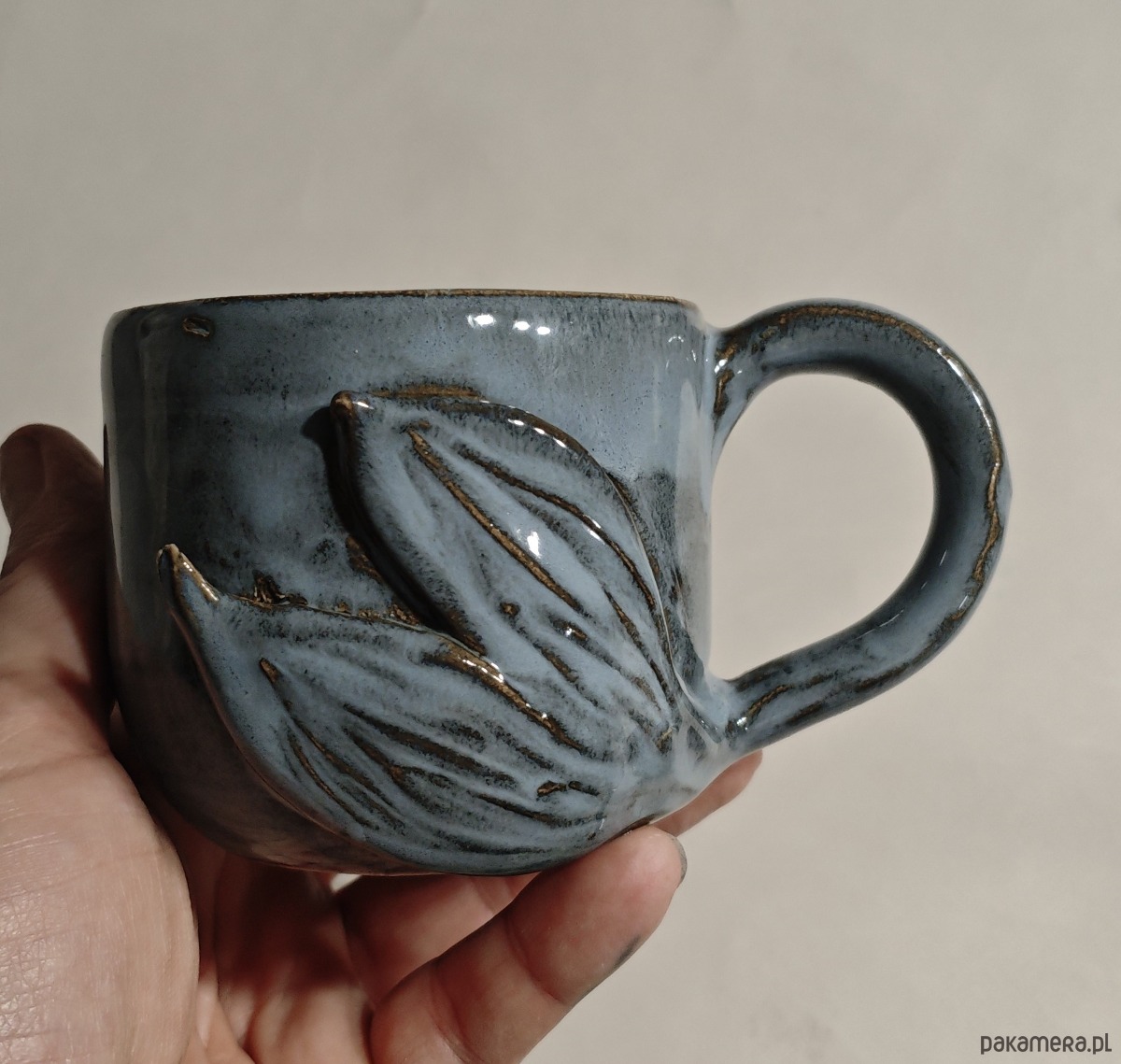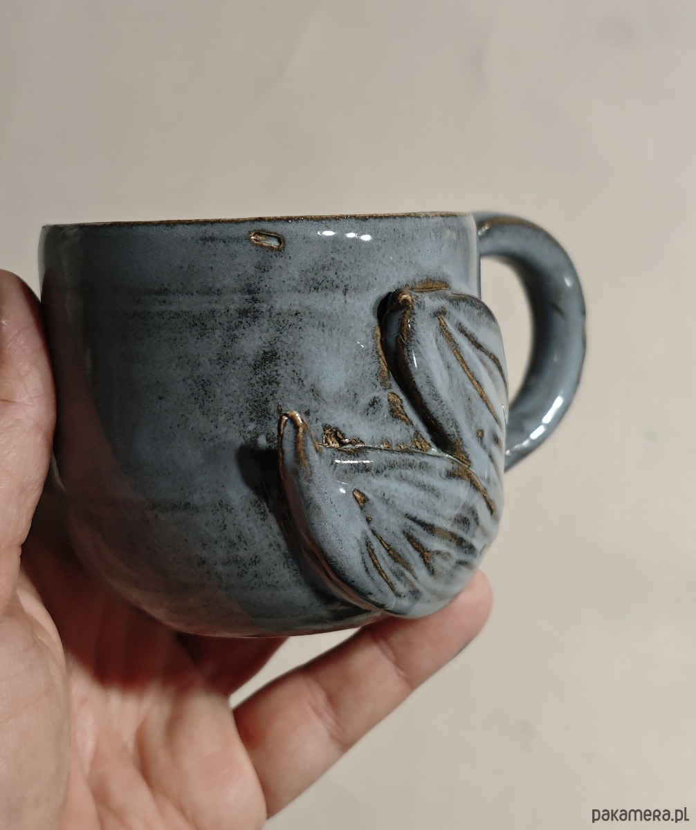 Wytoczony na kole garncarskim, ozdobiony uszkiem w kształcie ogona wieloryba.