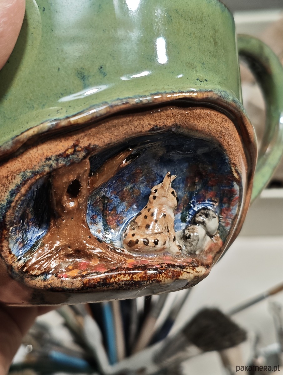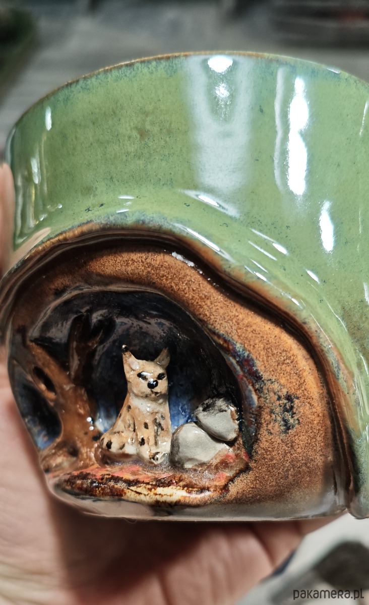 Wytoczony na kole garncarskim,ozdobiony okienkiem z rysiem..