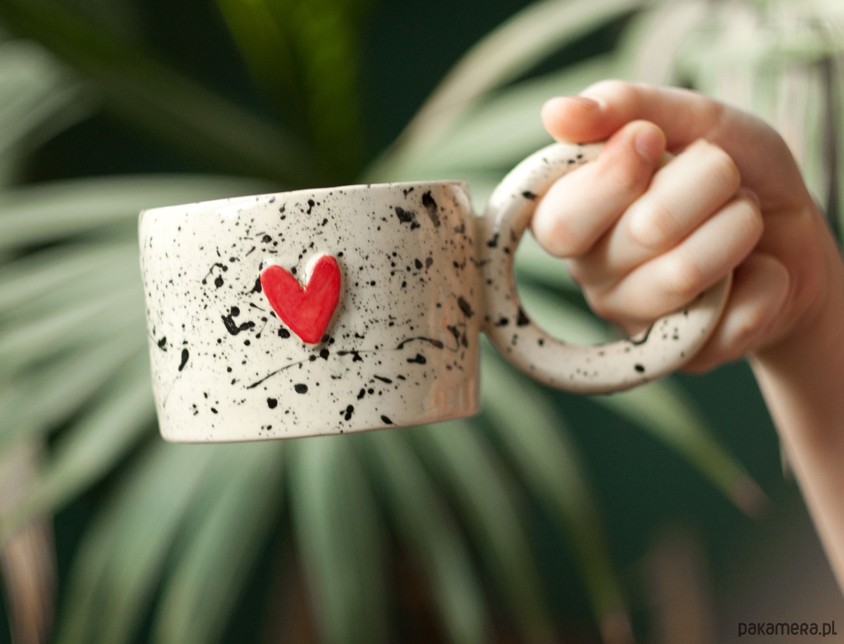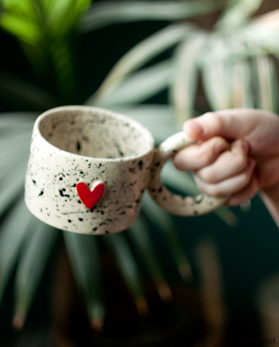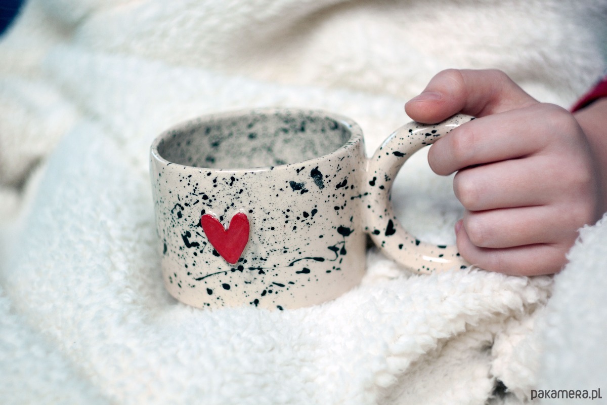 Ceramiczny kubek, wykonany ręcznie. Toczony na kole garncarskim. Pojemność 280 ml. Wielki, super wygodne ucho (chociaż nie wygląda, zapewniam, trzyma się bardzo pewnie i wygodnie). Ręcznie malowany - zdobiony czarnymi kleksami i czerwonym sercem.