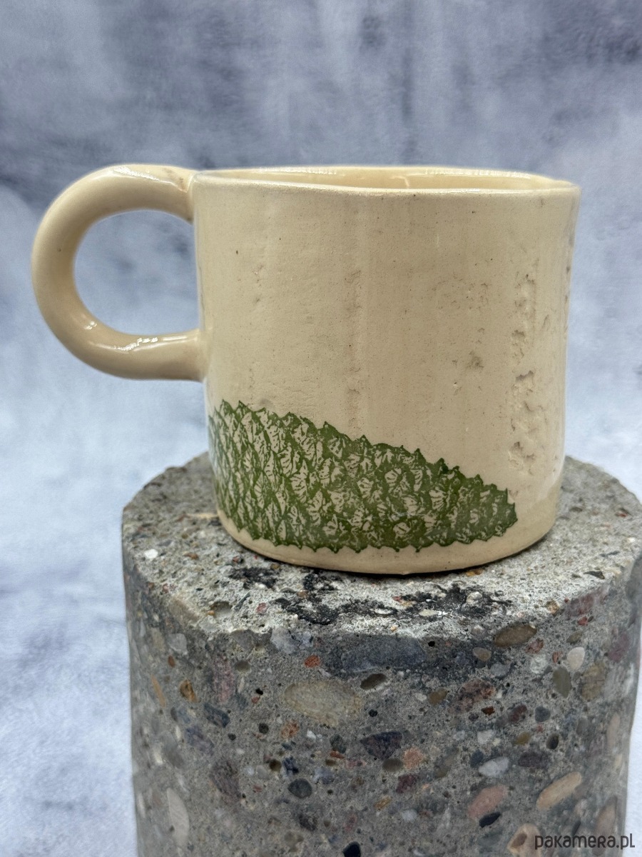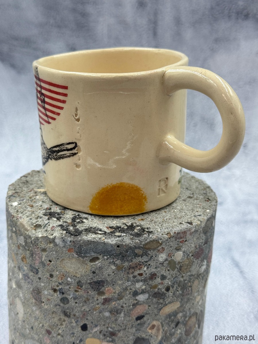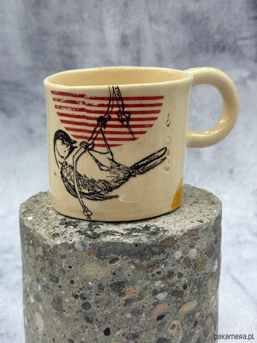 Ręcznie wykonany kubek z naturalnej gliny od Rabilla Ceramics to wyjątkowy element codziennych rytuałów. Jego lekko krzywy kształt, jakby uformowany przez naturę, nadaje mu niepowtarzalny charakter, a ciepły kremowy odcień wprowadza spokój i harmonię do każdej chwili. Wygodny uchwyt doskonale leży w dłoni, czyniąc go idealnym towarzyszem podczas relaksu przy ulubionym napoju. Zdobiony motywami sikorką, kubek emanuje radością i bliskością natury. Wzory naniesione metodą sitodruku są tak samo unikatowe jak sam kubek – formy i sita do druku powstały ręcznie w naszej pracowni. Trwały i odporny, nadaje się do mycia w zmywarce, co czyni go praktycznym wyborem. Wymiary: wysokość 7,5 cm, średnica 8 cm, pojemność 250 ml.