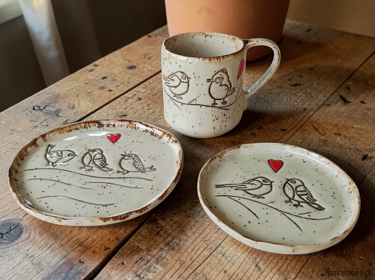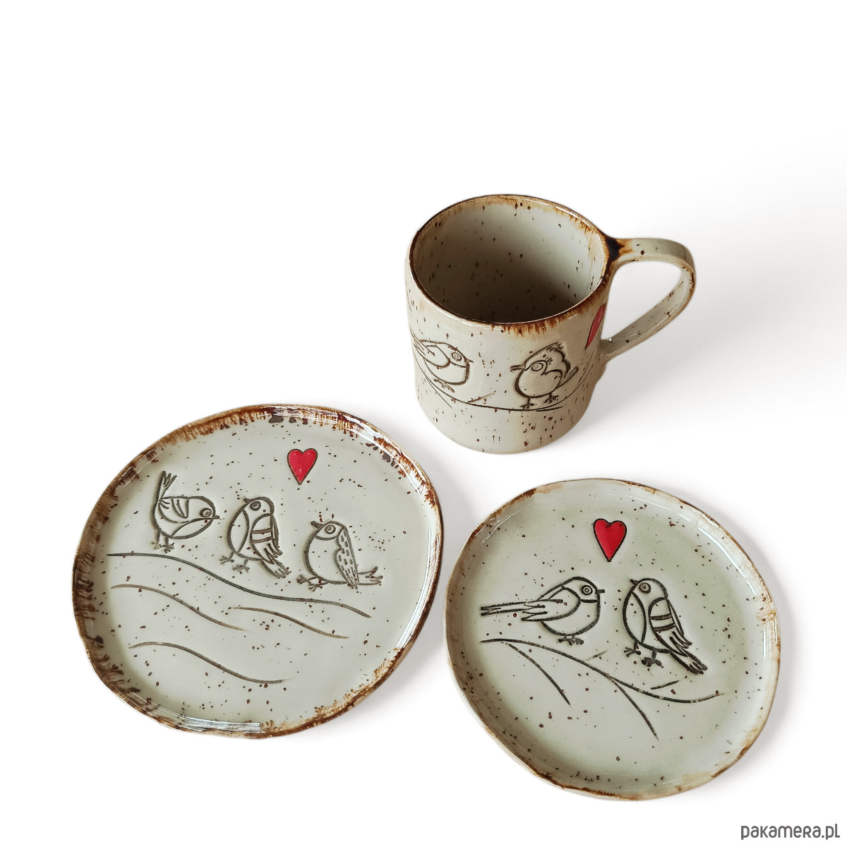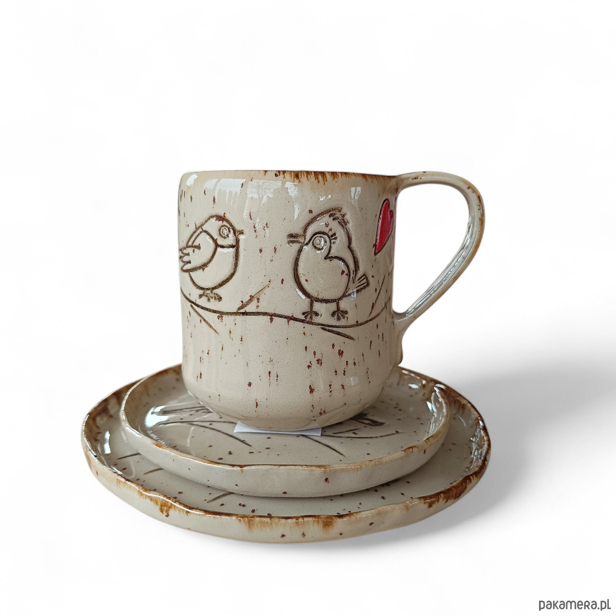 Ceramiczny komplet składający się z kubka i, talerzyka i podstawka.