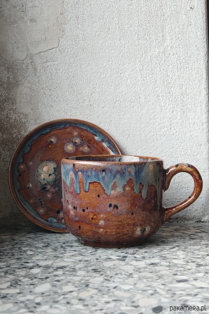 Kubek o pojemności 400 ml, wymiary: wysokość 10 cm, szerokość 7,5 cm w komplecie z talerzykiem o średnicy 12 cm.