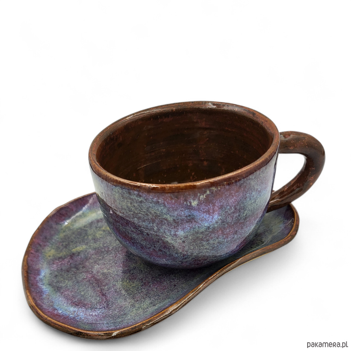 Duży toczony kubek z ręcznie formowanym talerzykiem