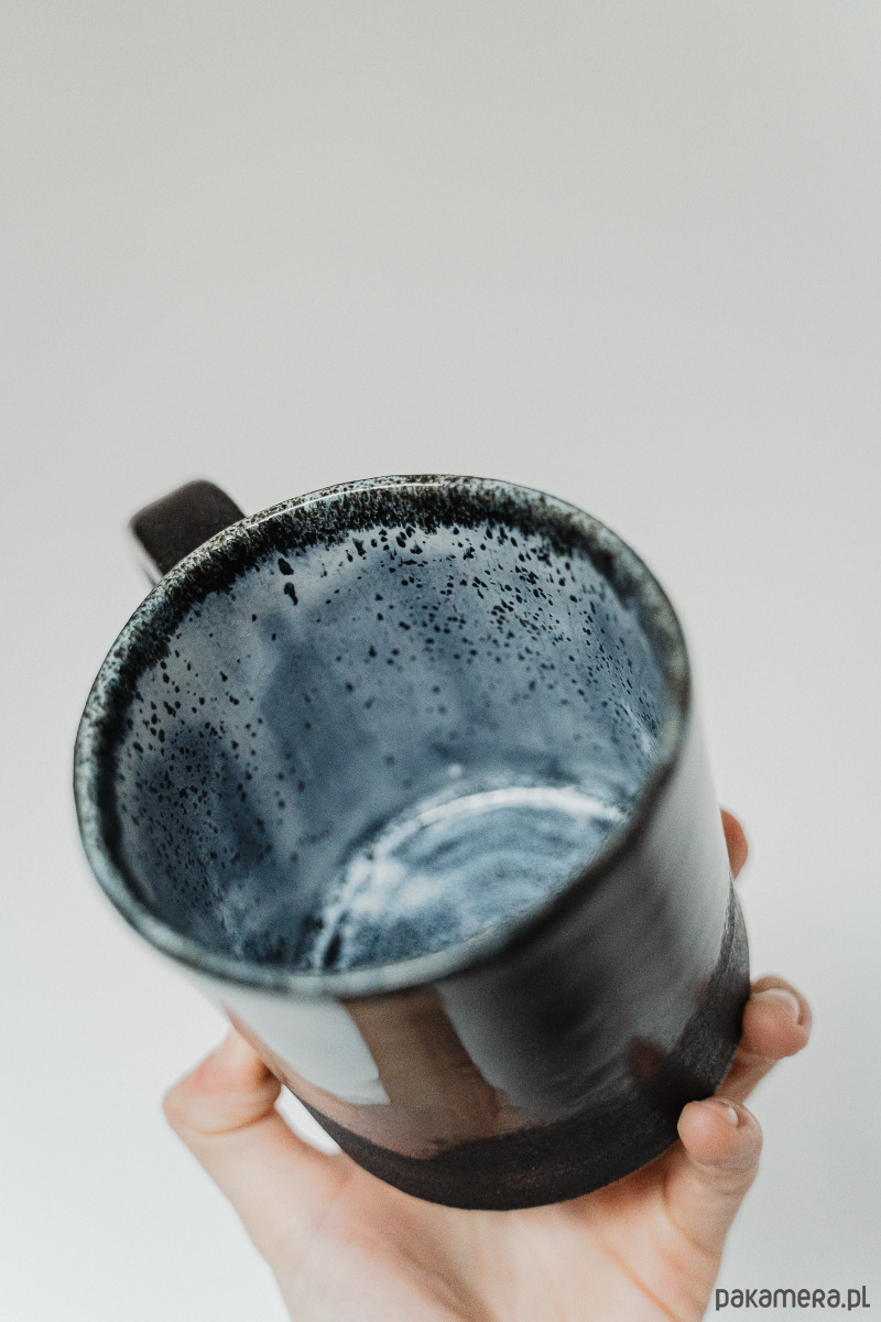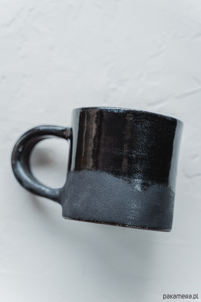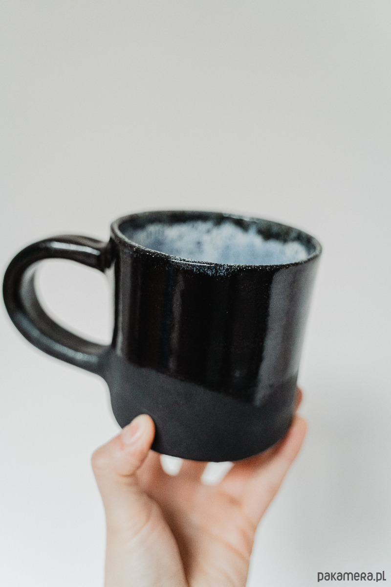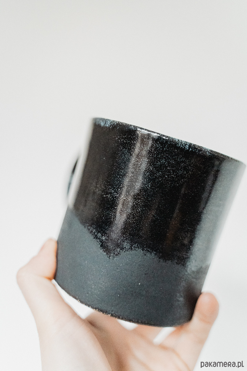 Kamionkowy kubek wykonany ręcznie z czarnej gliny. Pokryty czarnymi szkliwami - brokatowym i matowym.